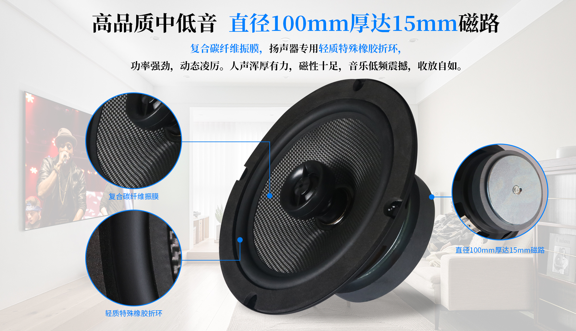 3. 高品質(zhì)中低音 直徑100mm厚達(dá)15mm磁路