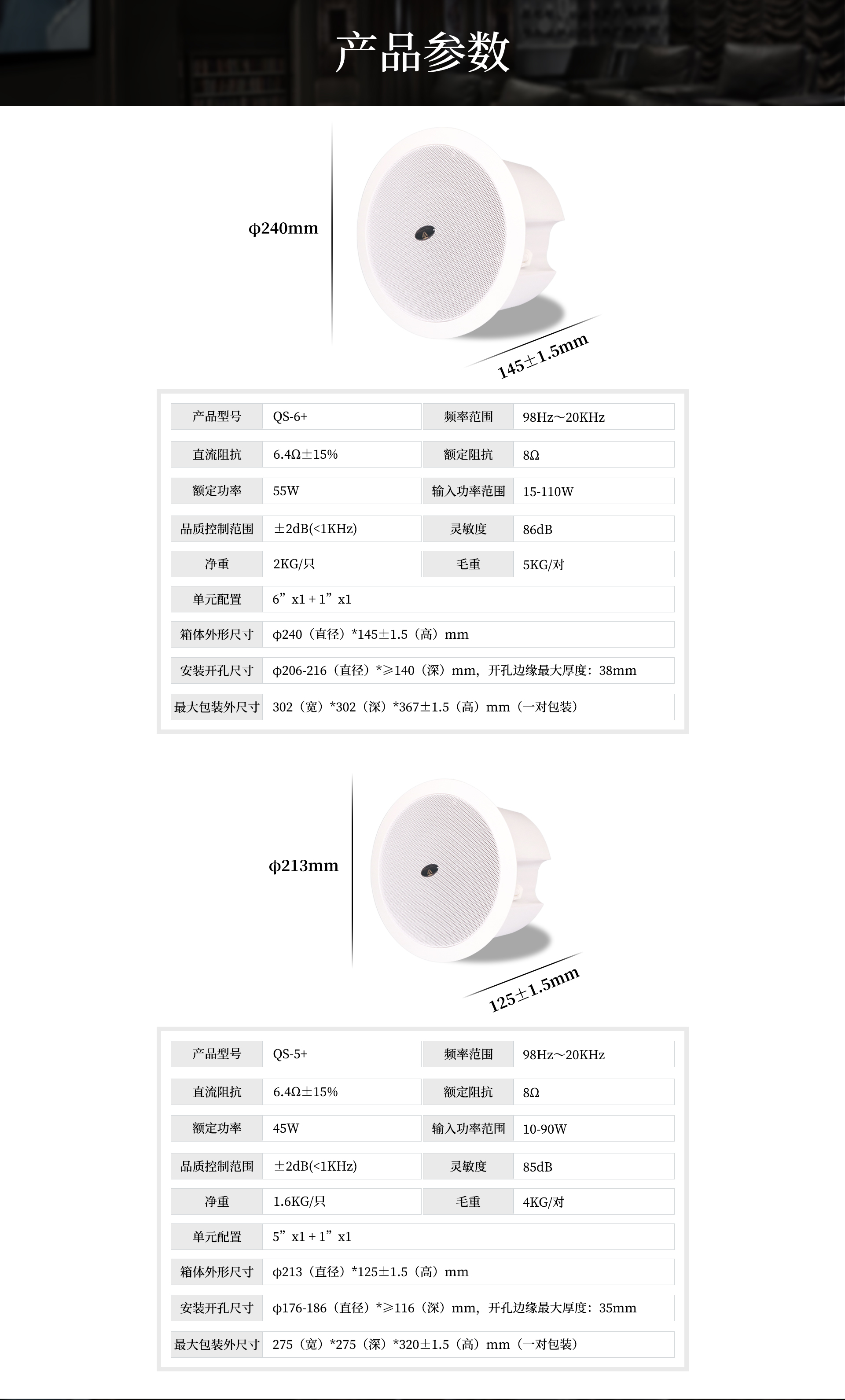 | 單元配置: 5"x1+1"x1 | 箱體外形尺寸:Φ213(直徑)*125±1.5(高)MM |