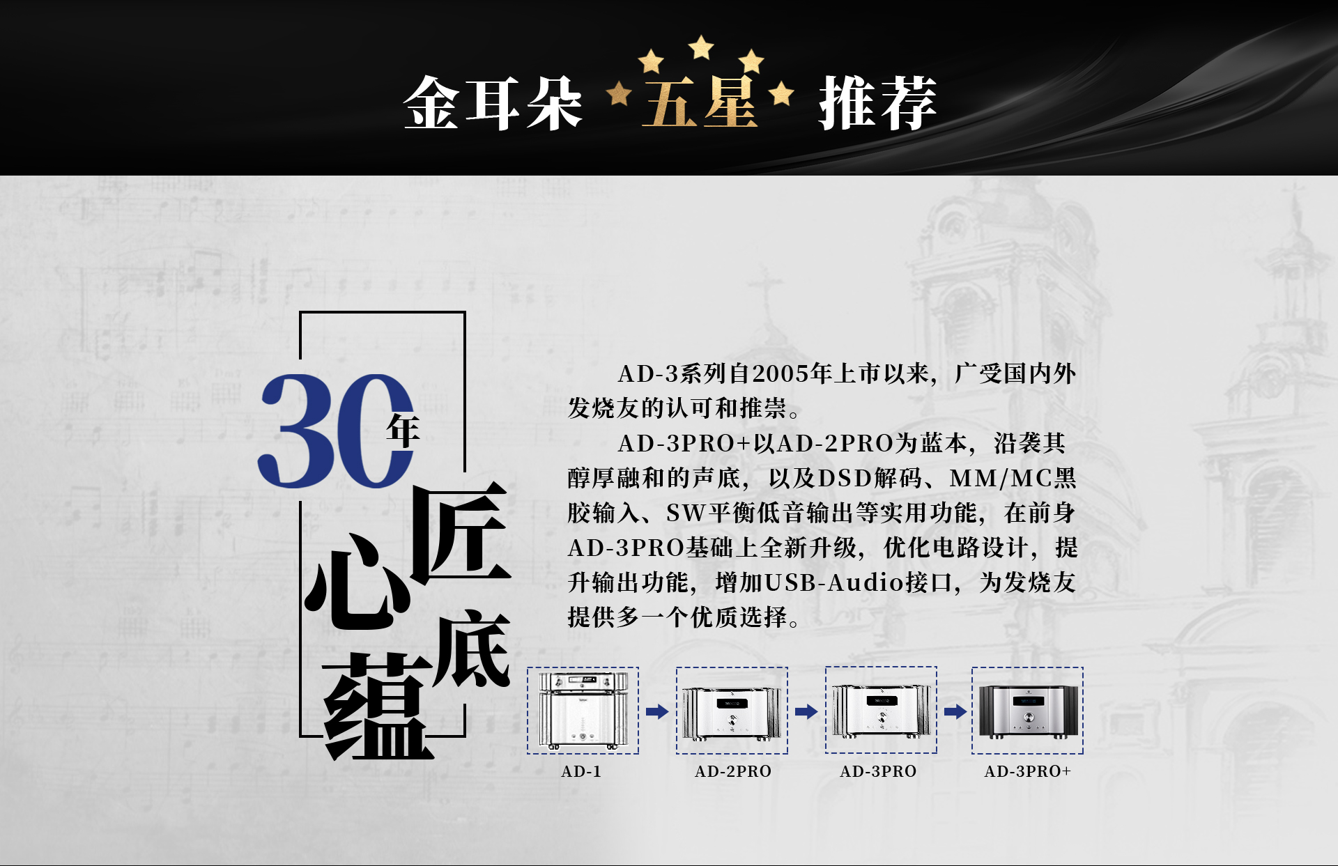 簡介:AD-3PRO+以AD-2PRO為藍本,沿襲其醇厚融和的聲底,以及DSD解碼、MM/MC黑膠輸入、SW平衡低音輸出等實用功能,并在前身AD-3PRO基礎上全新升級,增加USB-Audio接口,USB解碼芯片CT7601PR、提升輸出能力、優化電路設計等,實力打造每一處細節,滿足發燒友的音樂追求!