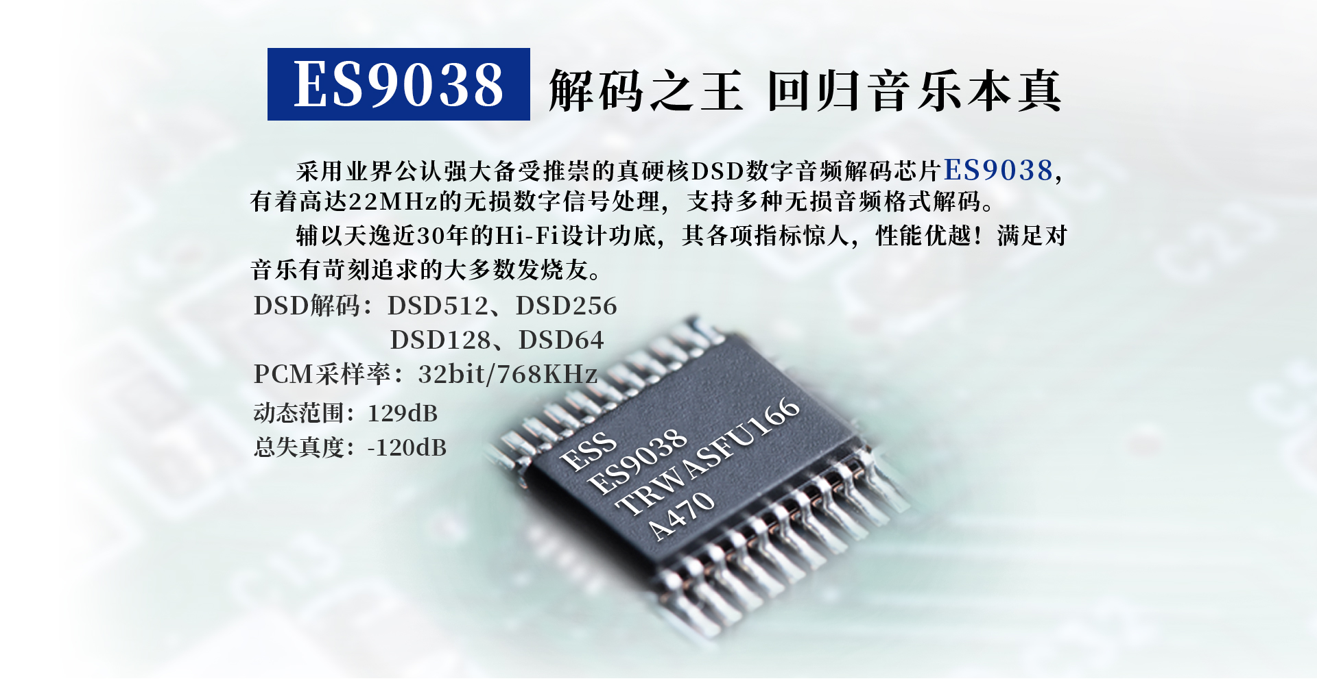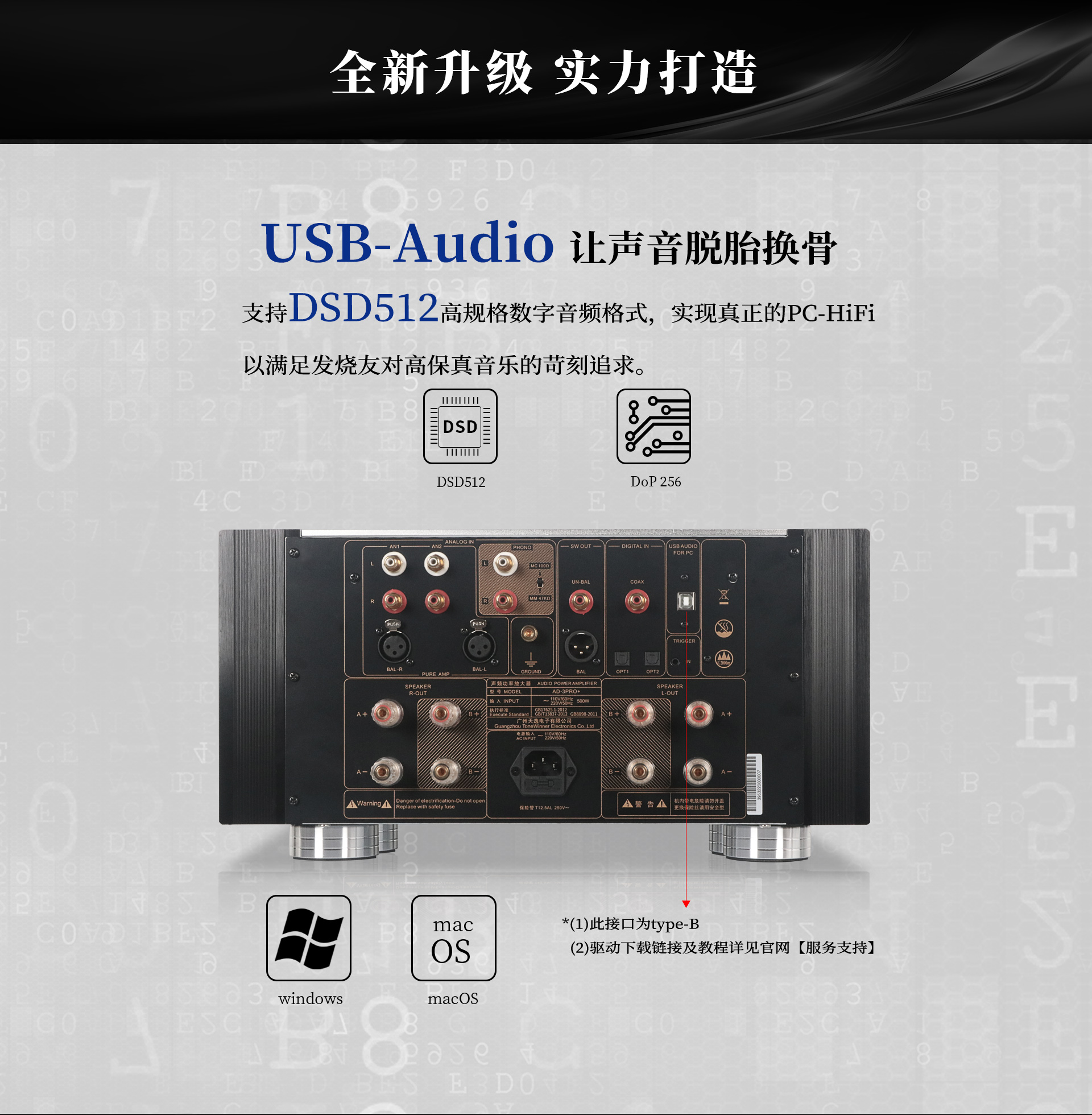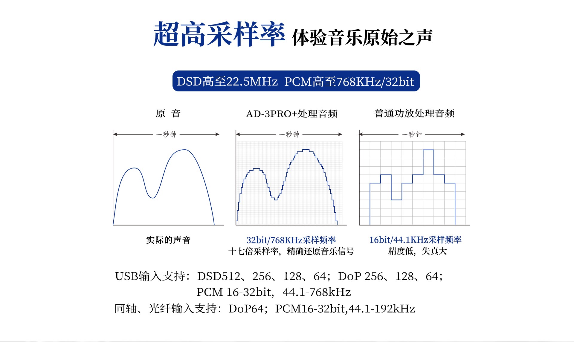 失真度: ≤0.05%(1KHz,正常工作條件) USB輸入支持: DSD512、 256、 128、 64;DoP256 、128 、64 ;PCM16-32bit,44.1-768kHz