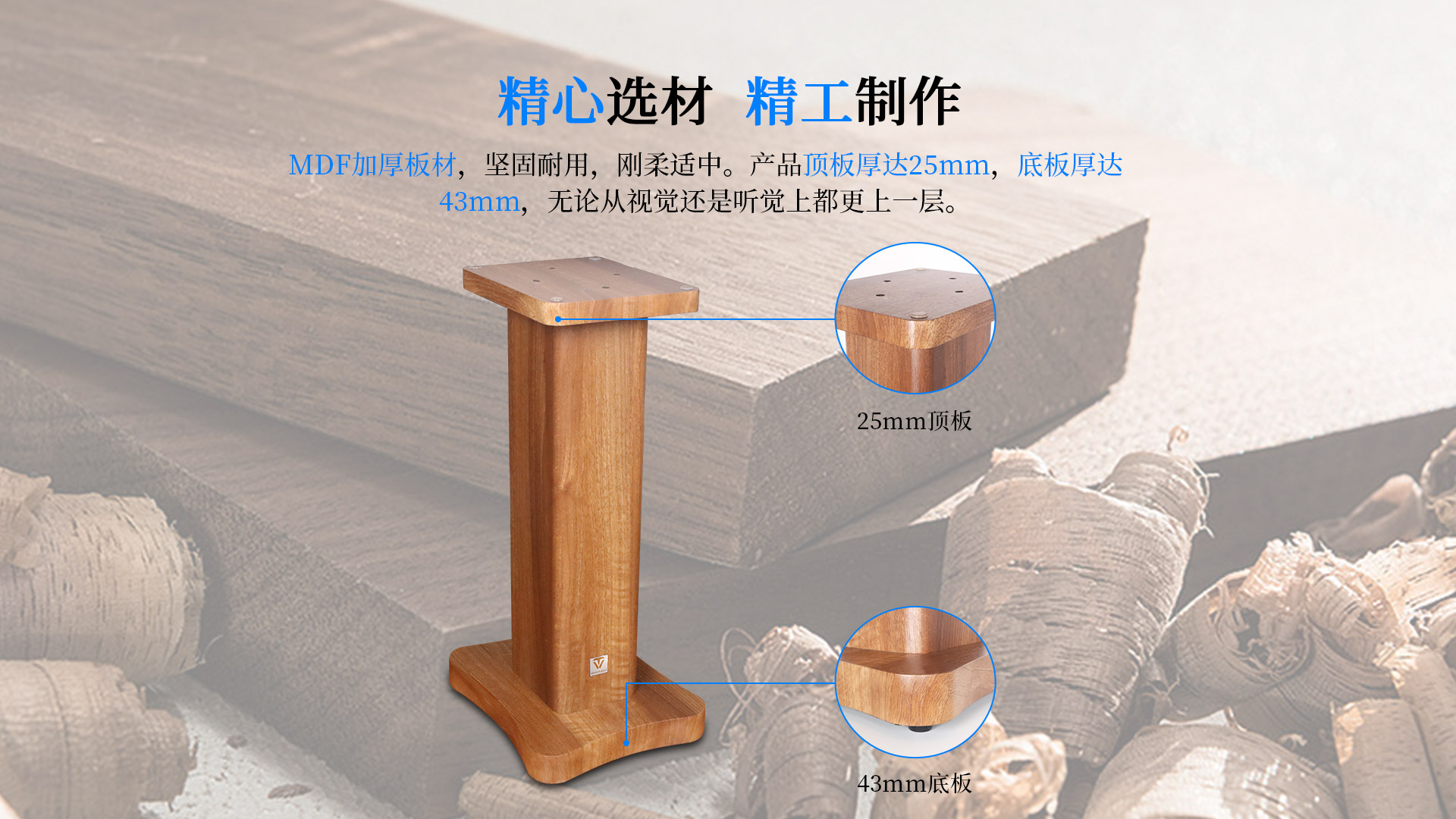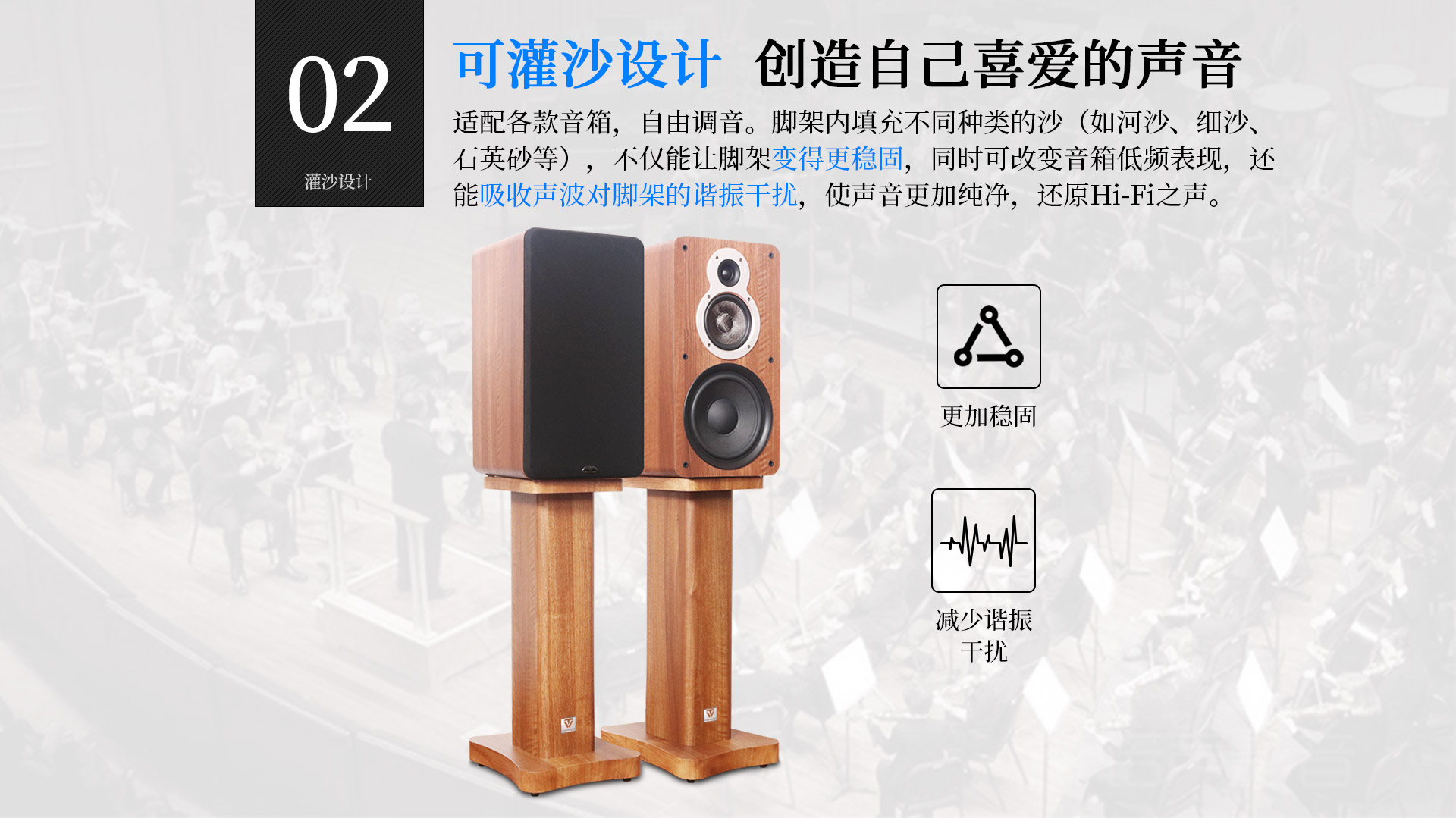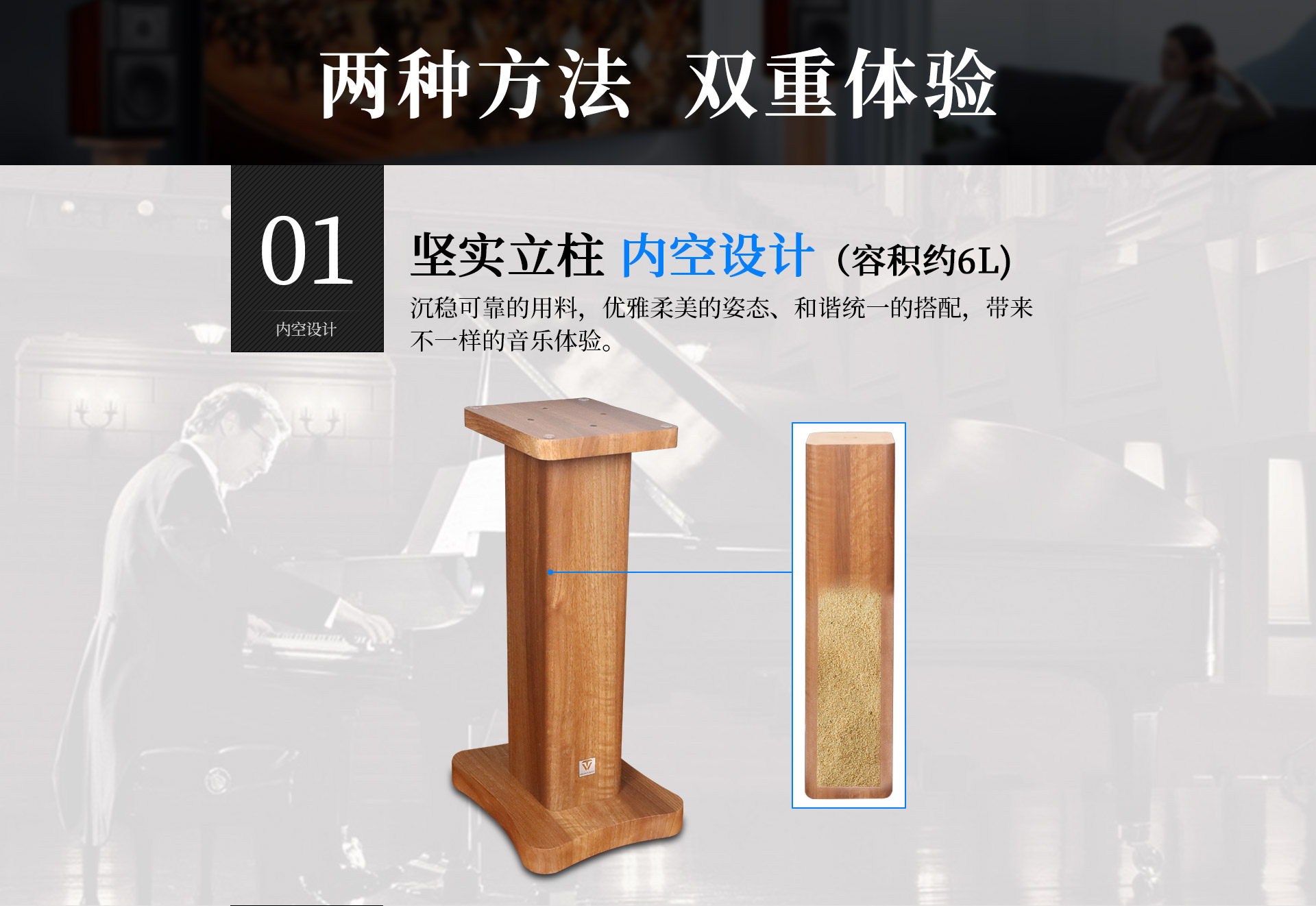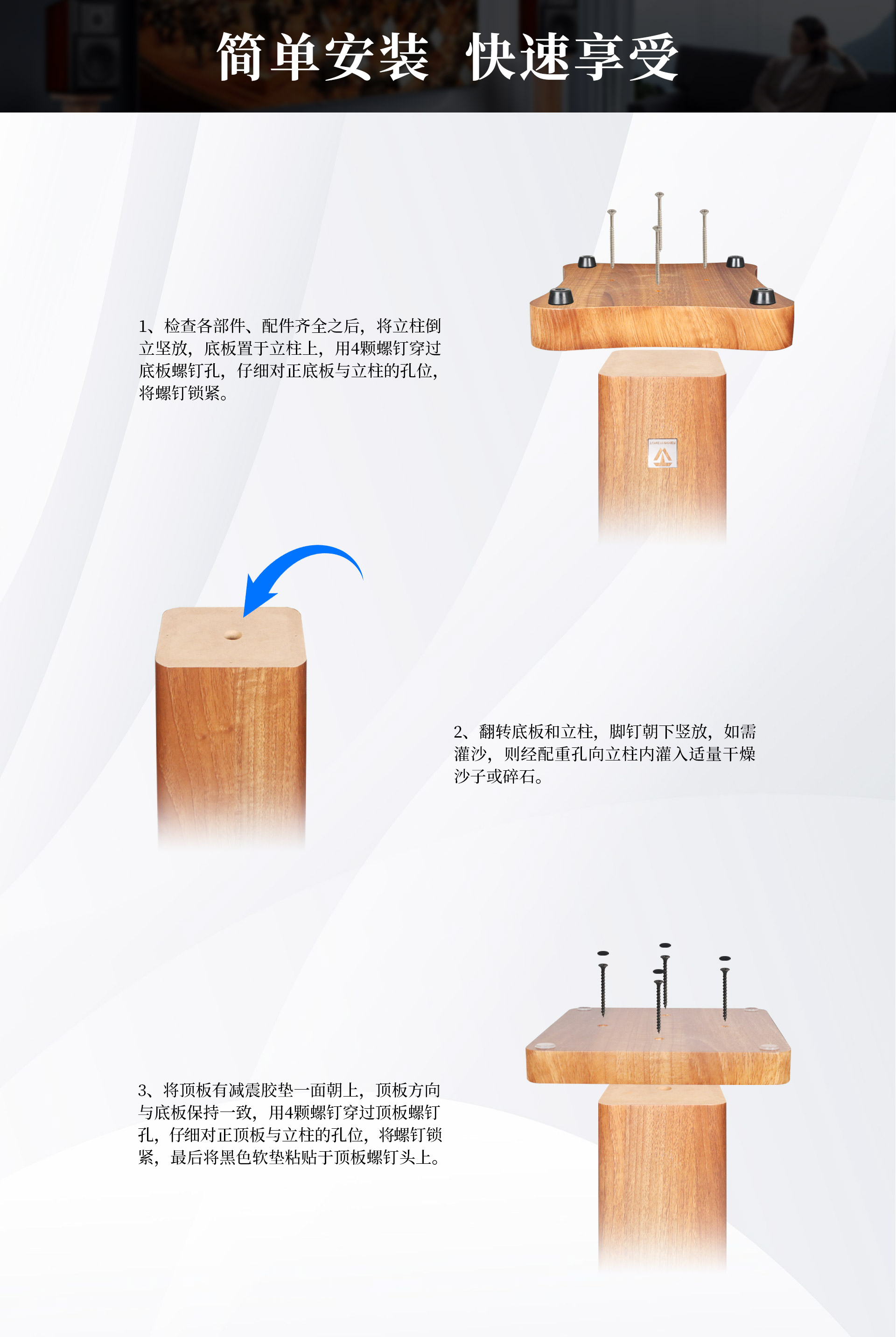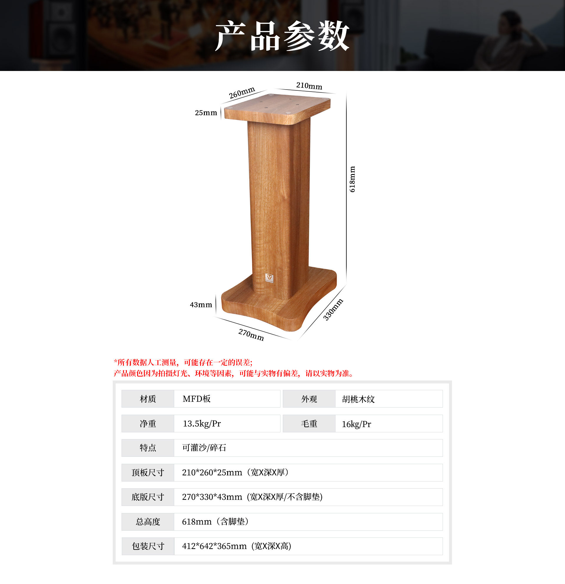 一、總體特點 1. 胡桃木紋外觀,設計簡約,優(yōu)雅時尚,與家居百搭,彰顯高端品味。 2. 采用MDF加厚板材,其頂板厚達25mm,底板更是厚達43mm,堅固耐用,穩(wěn)重大氣。 3. 空心立柱可通過灌入干燥的沙來增加重量。不僅能讓腳架變得更加穩(wěn)固,也可以有效地干涉音箱與腳架的總體諧振狀況。同時,可以根據(jù)灌沙的總量創(chuàng)作出自己喜歡的聲音,亦使聲音更加純凈,還原最真實的Hi-Fi之聲。 4. 618mm黃金比例腳架總高度,視覺上極具美感,更是聽覺上的盛宴。 5. 精確計算的高度能與大多數(shù)書架音箱配合,使其高音單元與聽眾坐下后的耳朵高度基本保持同一水平。通過合理的高度及擺放方式,能讓聽眾獲得美好的聽音感受,呈現(xiàn)更多音樂細節(jié)。 6. 四顆高彈柔性防滑墊位于頂板上方,既能有效減少低頻共振,也能防止因低頻震動導致的音箱移位甚至跌落損壞。 7. 四只加厚減震機腳,能有效降低音箱諧振,起到柔化音質,提升音頻質感的作用;同時也有效避免地面潮濕對腳架造成損壞。 8. 安裝簡單快速,只需三步就能享受高保真Hi-Fi音樂。 9. 適用于多種場景,如:客廳、書房、臥室,選擇擺位靈活多樣。