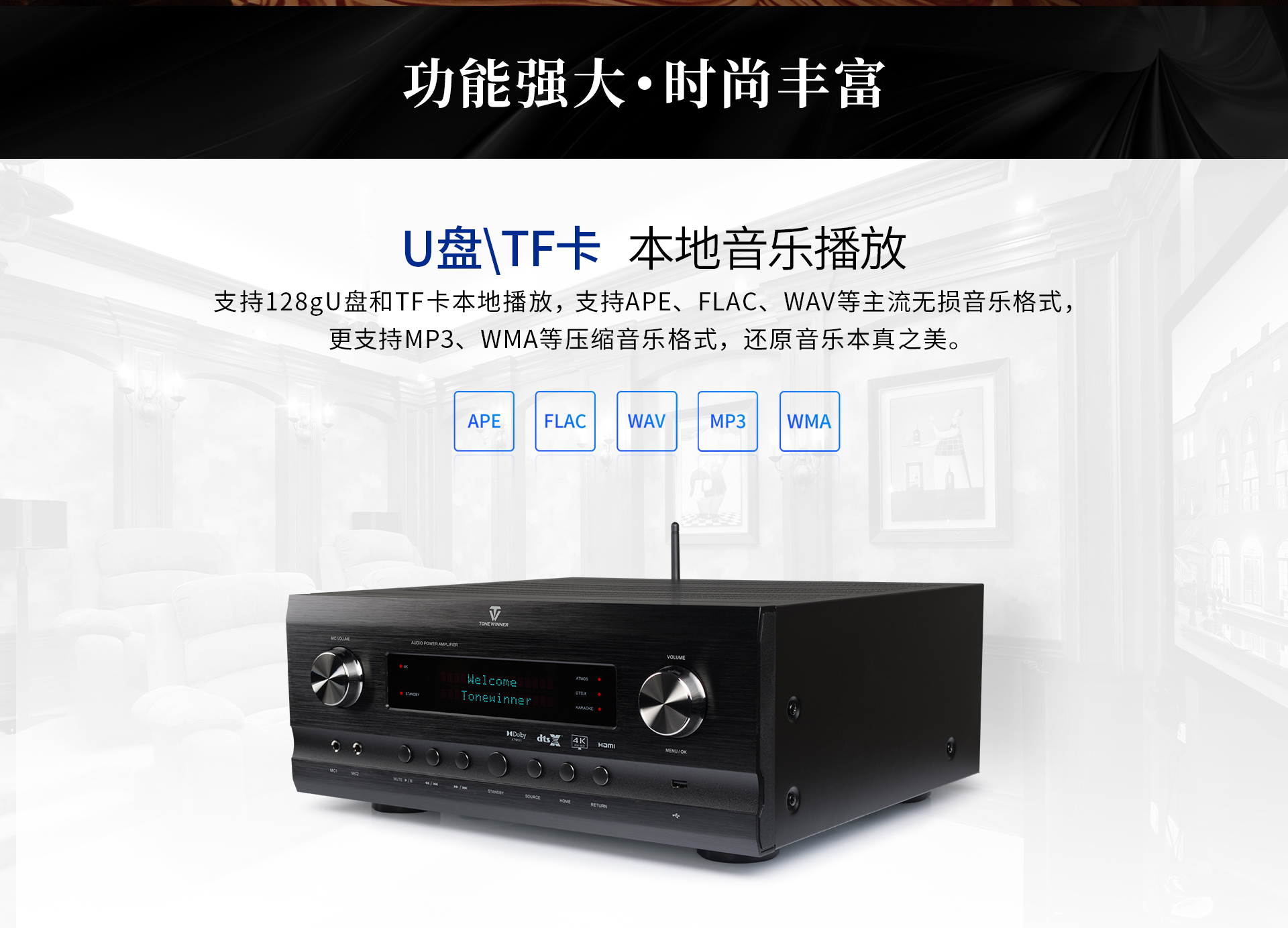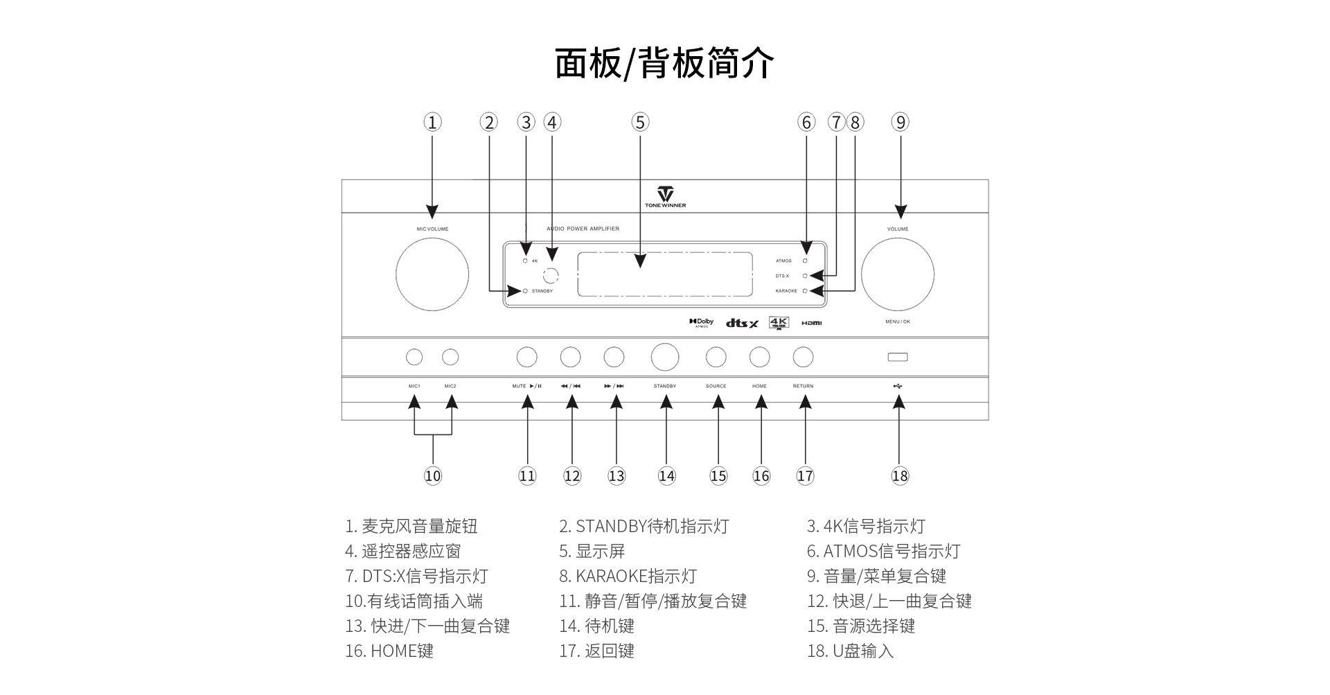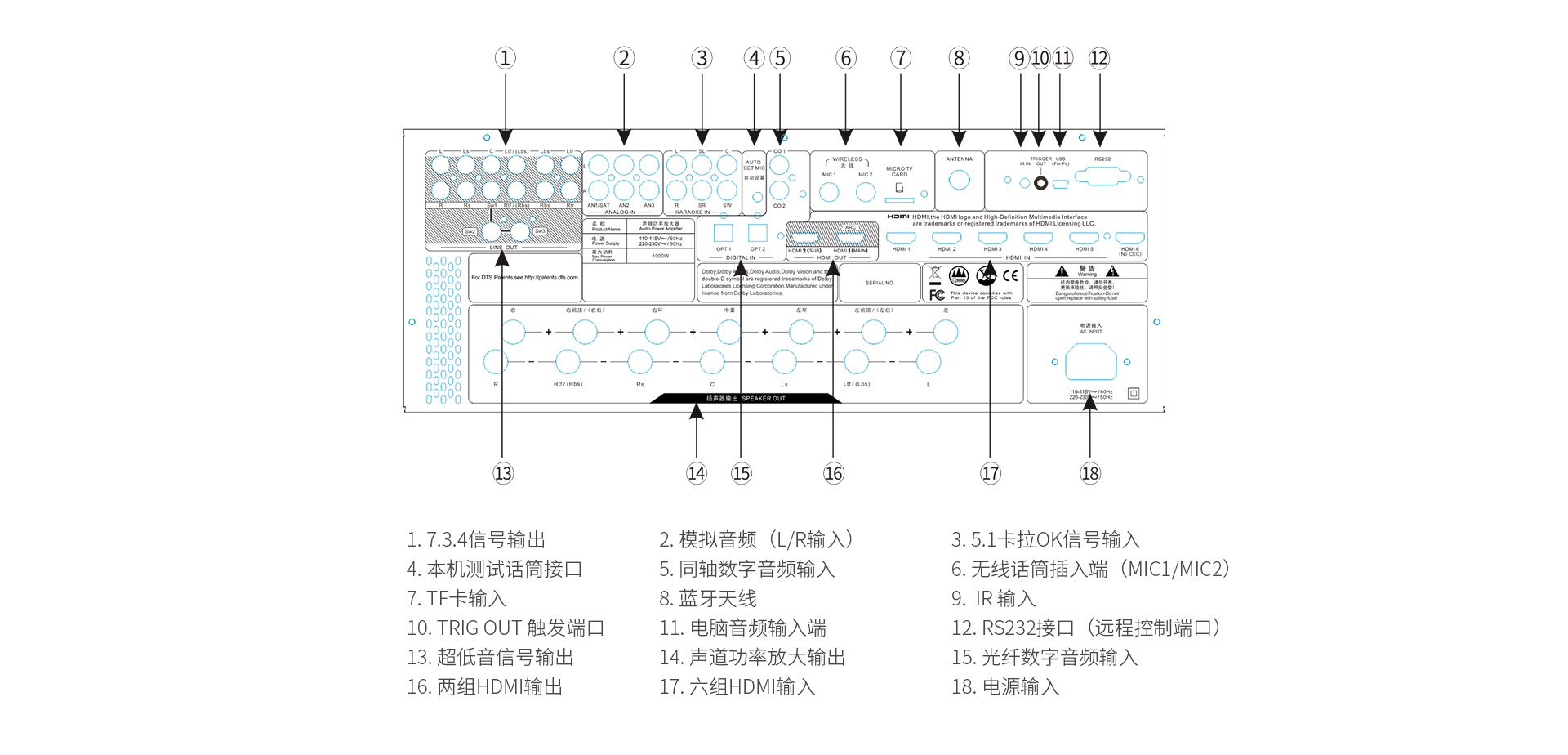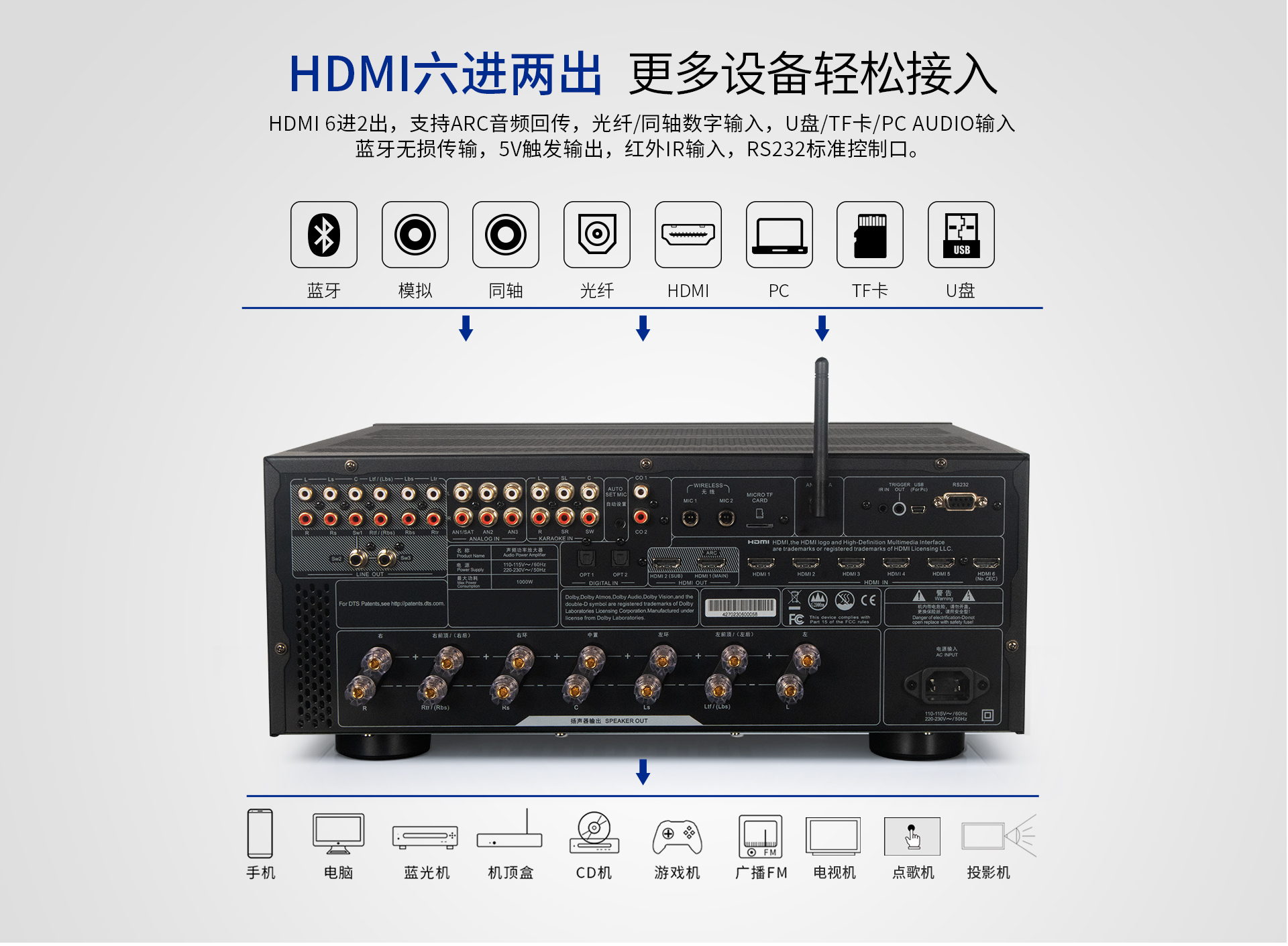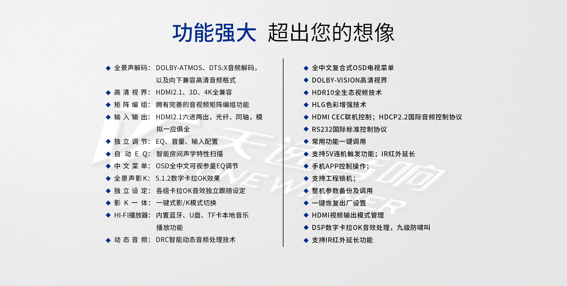 音頻處理部分: 1、 支持先進的DOLBY-ATMOS、DTS:X音頻解碼,以及向下兼容所有高清音頻格式解碼;包括 Dolby True-HD、Dolby Digital Plus、DTS Master、DTS HI RES等等。 2、 擁有完善的音視頻矩陣編組功能。 3、 HDMI2.1六進兩出,各輸入組獨立編組,模式、音量、卡拉OK獨立編組記憶,獨立調節(jié); 4、 智能房間聲學特性掃描; 5、 OSD全中文5段(低音) + 11段(全頻通道)EQ調節(jié),參量與圖示同步顯示。 6、 各輸入組EQ獨立選定及調節(jié); 7、 卡拉OK開關獨立跟隨設定。 8、 具備最長1000毫秒唇音同步技術; 9、 強大的低頻管理:前置、中置、環(huán)繞、后置、天空聲道分組獨立調節(jié)慮波器拐點、斜率;低音增強等功能; 10、 根據需求可實現多種聲場布局: 5.3、7.3、5.1.4、5.3.2、5.3.4、7.3.4 11、 左、右、中置各聲道輸出230W/8Ω,環(huán)繞、天空每聲道為120W,分配更加合理。 12、 一鍵式影/K模式切換(內置效果器、外置純人聲、外置效果器三種選擇); 13、 卡拉OK音量及音樂音量開關機設定; 14、 5.1.2沉浸式數字卡拉OK效果;DSP數字卡拉OK音效處理,九級防嘯叫; 15、 支持外置效果器接入,并可實現獨立編組,RCA端口外置效果器輸入; 16、 內置藍牙音樂無線傳輸功能; 17、 內置U盤、TF卡本地音樂播放功能; 18、 USB外置聲卡功能,直接電腦數字音頻輸入; 19、 支持HDMI ARC音頻回傳; 20、 支持2組光纖,2組同軸,3組立體聲多功能音頻輸入; 21、 DRC智能動態(tài)音頻處理技術;