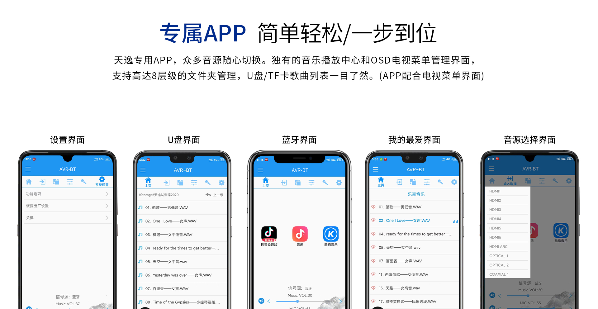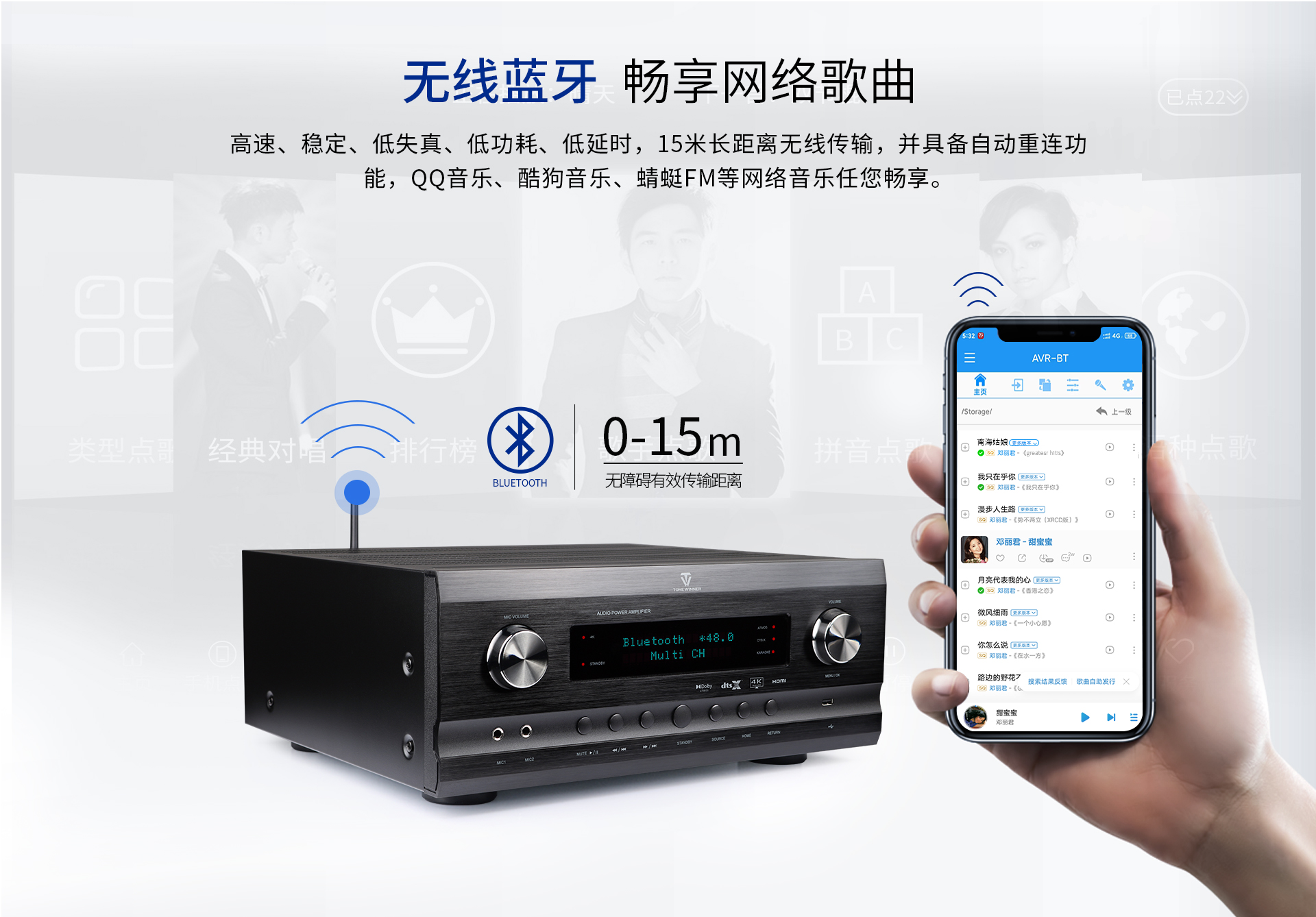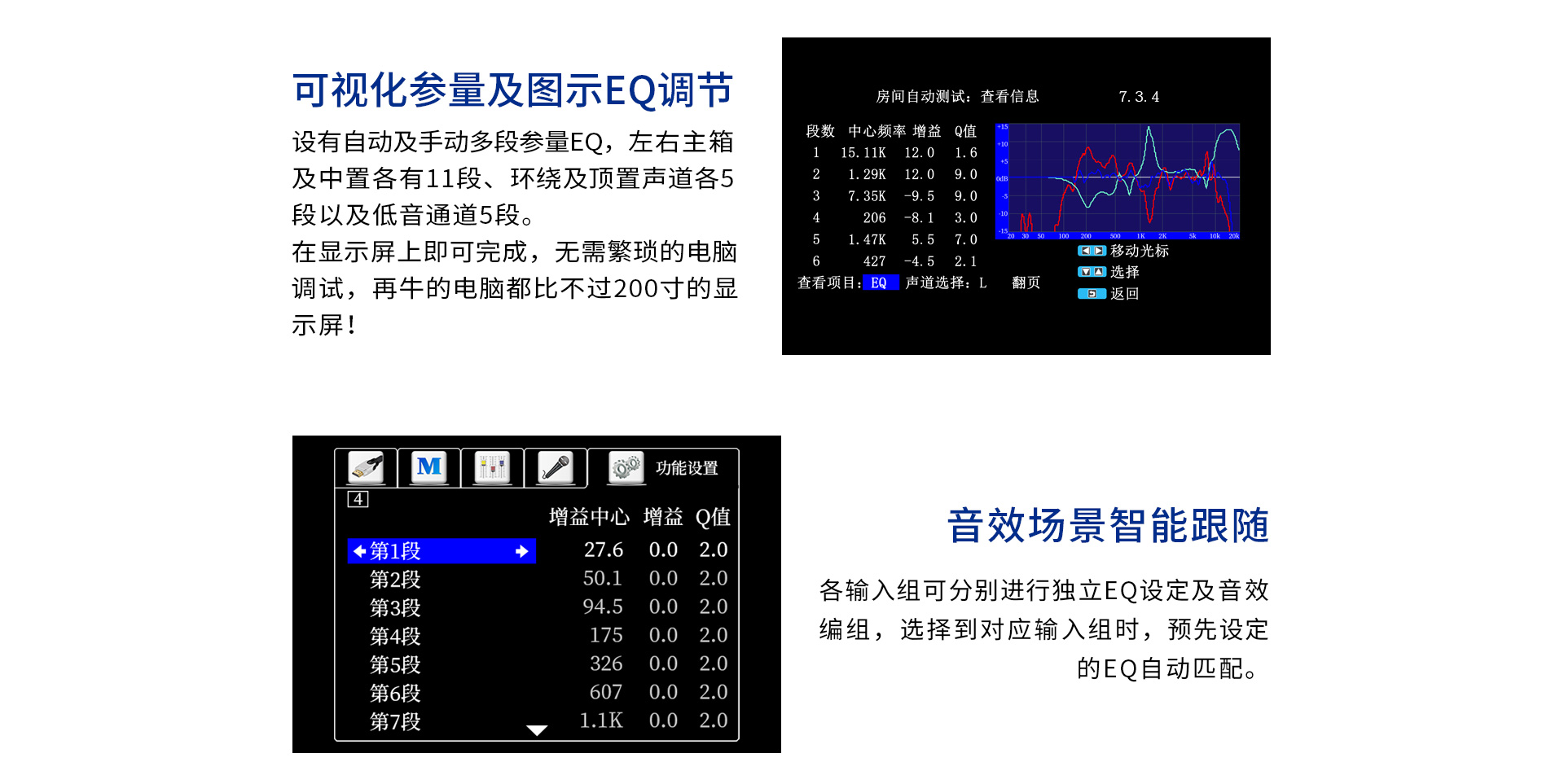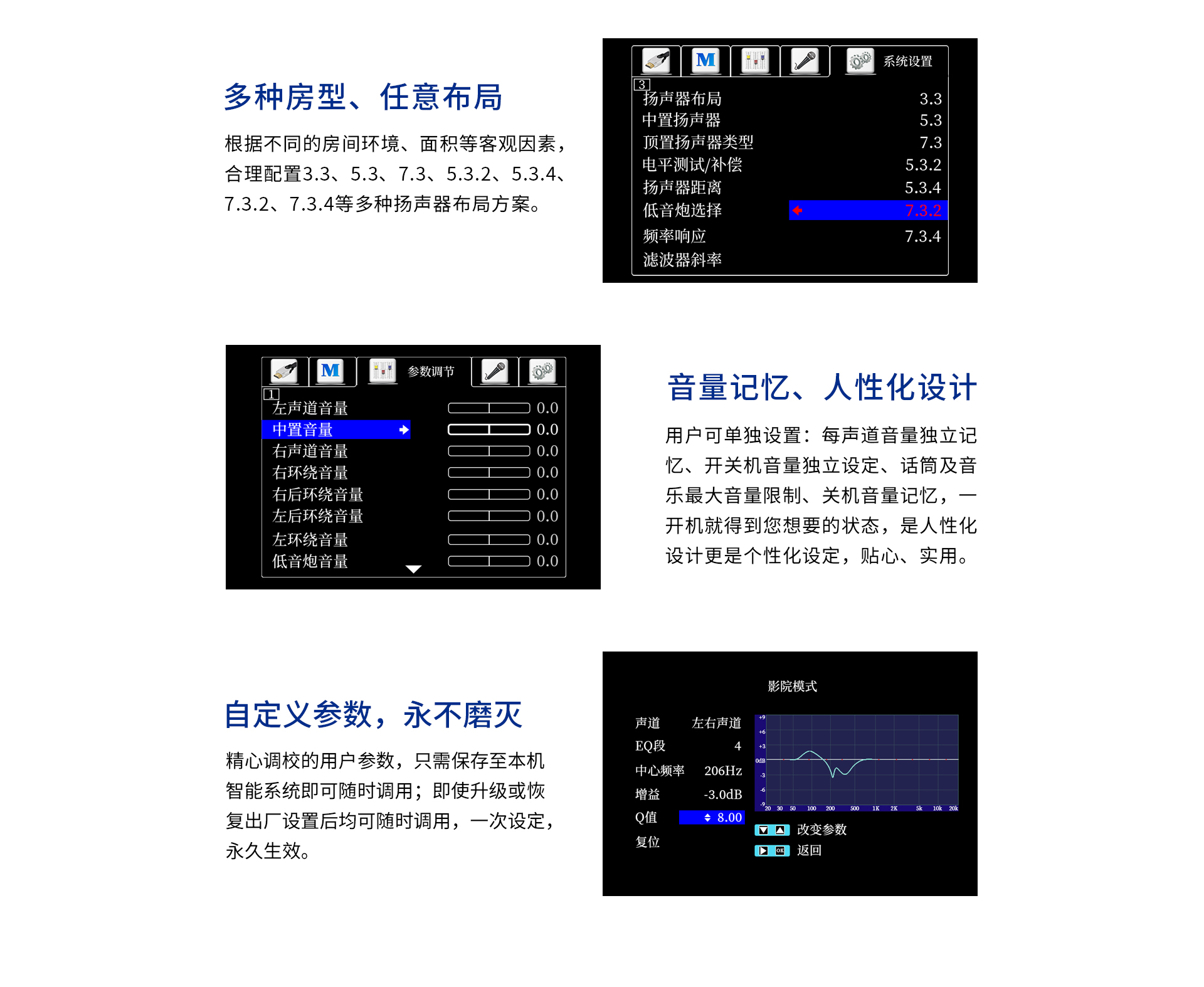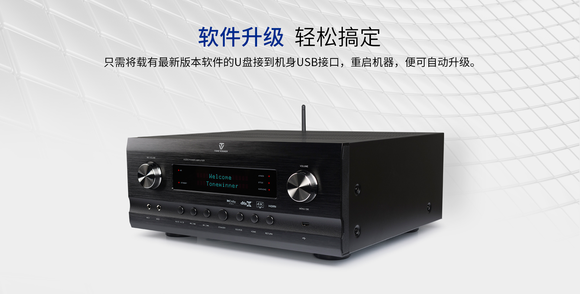 音頻處理部分: 1、 支持先進的DOLBY-ATMOS、DTS:X音頻解碼,以及向下兼容所有高清音頻格式解碼;包括 Dolby True-HD、Dolby Digital Plus、DTS Master、DTS HI RES等等。 2、 擁有完善的音視頻矩陣編組功能。 3、 HDMI2.1六進兩出,各輸入組獨立編組,模式、音量、卡拉OK獨立編組記憶,獨立調節(jié); 4、 智能房間聲學特性掃描; 5、 OSD全中文5段(低音) + 11段(全頻通道)EQ調節(jié),參量與圖示同步顯示。 6、 各輸入組EQ獨立選定及調節(jié); 7、 卡拉OK開關獨立跟隨設定。 8、 具備最長1000毫秒唇音同步技術; 9、 強大的低頻管理:前置、中置、環(huán)繞、后置、天空聲道分組獨立調節(jié)慮波器拐點、斜率;低音增強等功能; 10、 根據需求可實現多種聲場布局: 5.3、7.3、5.1.4、5.3.2、5.3.4、7.3.4 11、 左、右、中置各聲道輸出230W/8Ω,環(huán)繞、天空每聲道為120W,分配更加合理。 12、 一鍵式影/K模式切換(內置效果器、外置純人聲、外置效果器三種選擇); 13、 卡拉OK音量及音樂音量開關機設定; 14、 5.1.2沉浸式數字卡拉OK效果;DSP數字卡拉OK音效處理,九級防嘯叫; 15、 支持外置效果器接入,并可實現獨立編組,RCA端口外置效果器輸入; 16、 內置藍牙音樂無線傳輸功能; 17、 內置U盤、TF卡本地音樂播放功能; 18、 USB外置聲卡功能,直接電腦數字音頻輸入; 19、 支持HDMI ARC音頻回傳; 20、 支持2組光纖,2組同軸,3組立體聲多功能音頻輸入; 21、 DRC智能動態(tài)音頻處理技術;