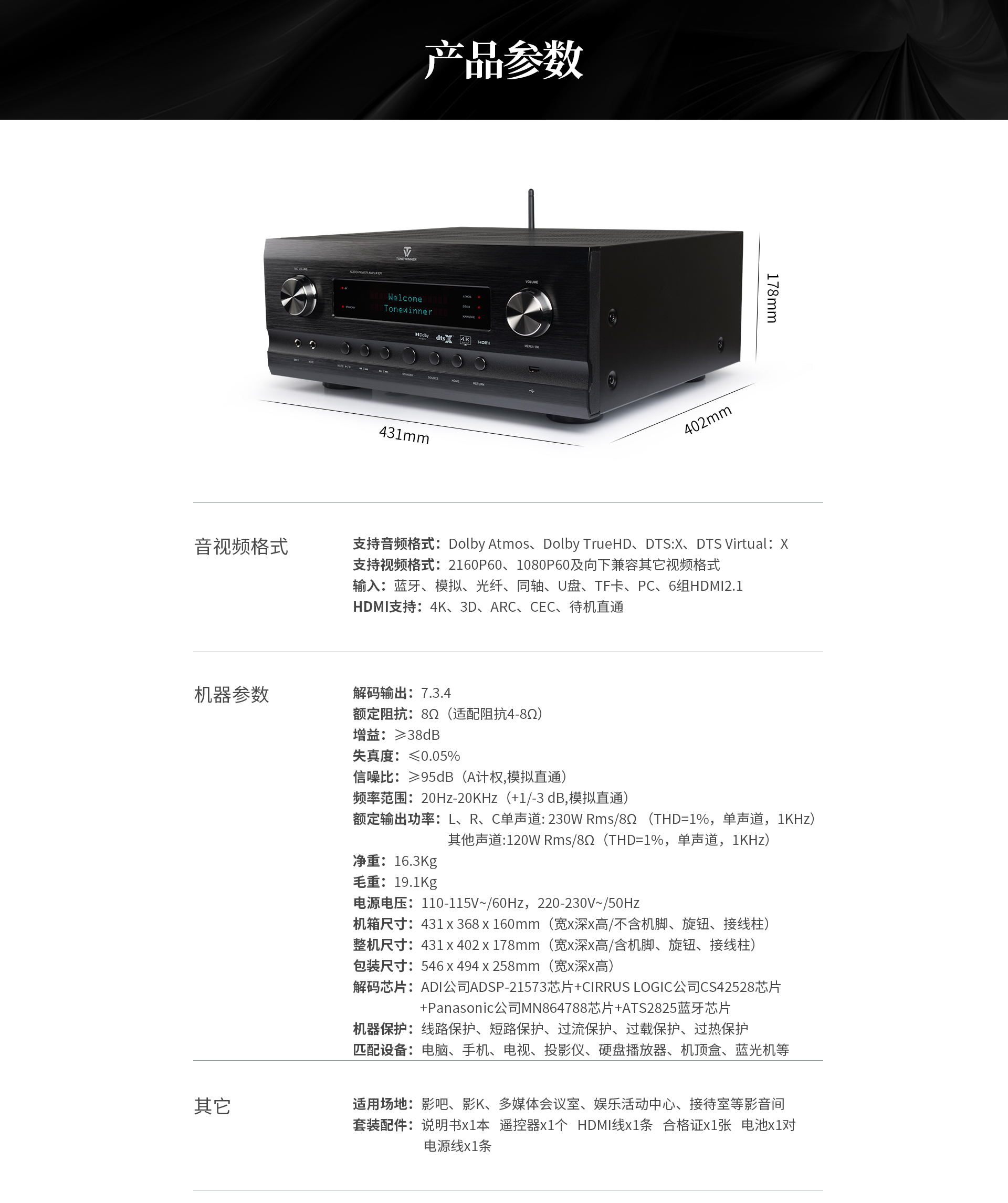 四、性能參數: 解碼輸出:7.3.4 增益:≥38dB 失真度:≤0.05% 信噪比:≥95dB(A計權,模擬直通) 頻率范圍:20Hz-20KHz (+1/-3 dB,模擬直通) 額定輸出功率:L、R、C 單聲道:230W Rms/8Ω (THD=1%,單聲道,1KHz);額定阻抗:8Ω(適配阻抗4-8Ω) 其他聲道:120W Rms/8Ω (THD=1%,單聲道,1KHz) 凈重:16.3Kg 毛重:19.1Kg 電源電壓:110-115V~/60Hz,220-230V~/50Hz 機箱尺寸:431×368×160mm (寬×深×高/不含機腳、旋鈕、接線柱) 整機尺寸:431×402×178mm (寬×深×高/含機腳、旋鈕、接線柱) 解碼芯片:ADI公司ADSP-21573芯片+CIRRUSLOGIC公司CS42528芯片+Panasonic公司MN864788芯片+ATS2825藍牙芯片機器保護:線路保護、短路保護、過流保護、過載保護、過熱保護 匹配設備:電腦、手機、電視、投影儀、硬盤播放器、機頂盒、藍光機等 |