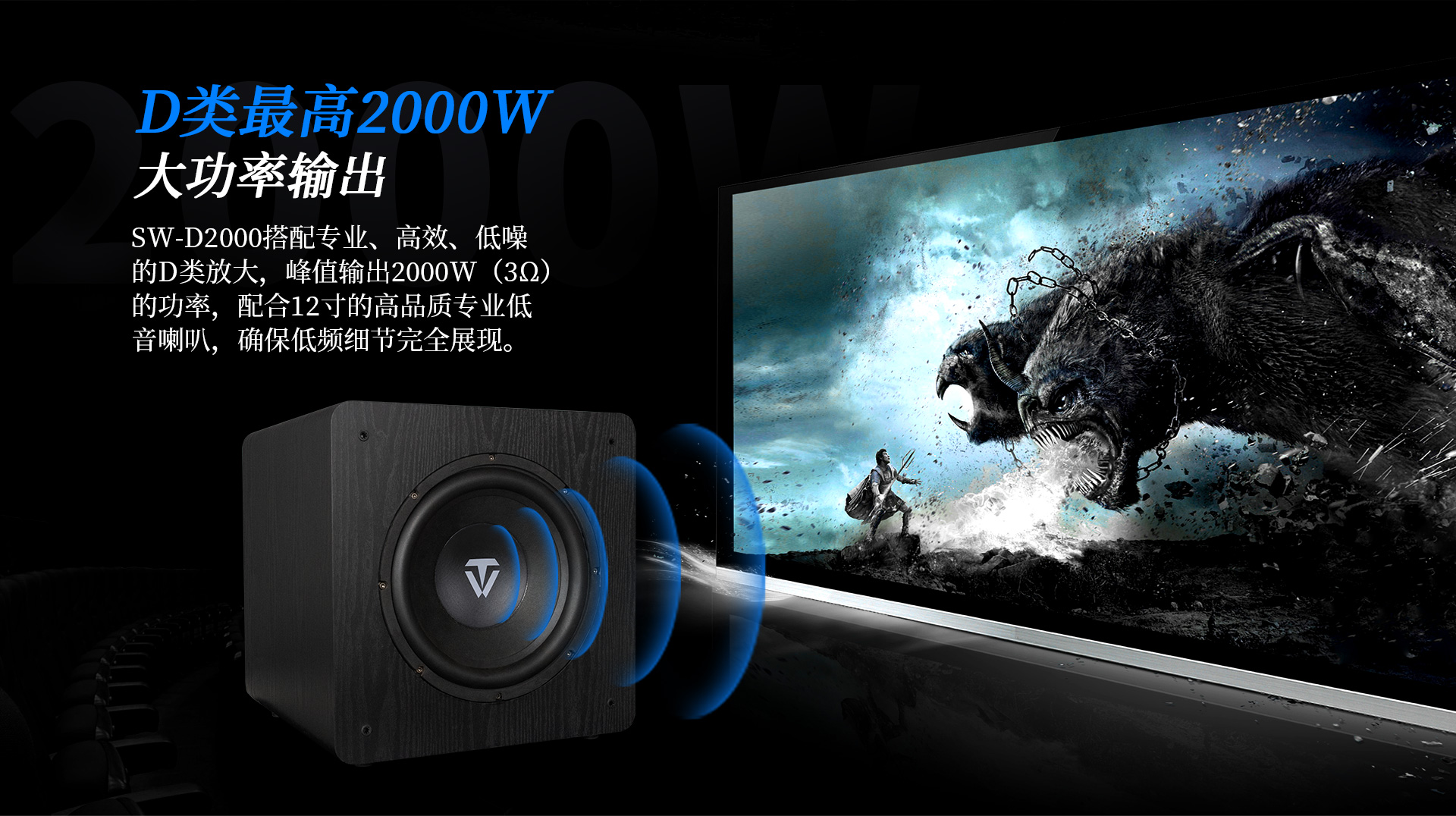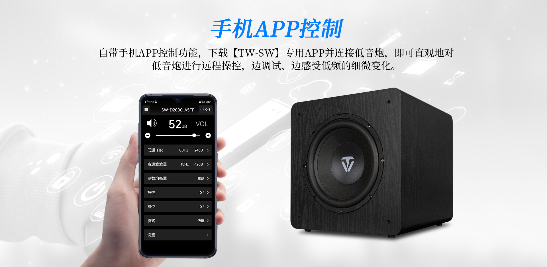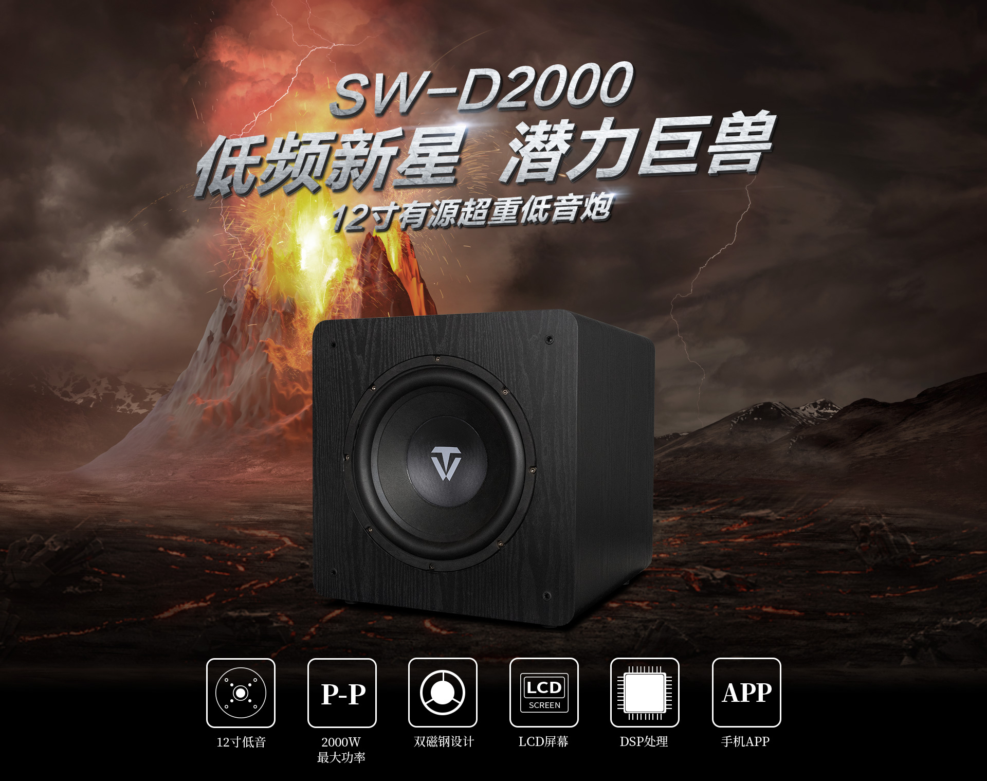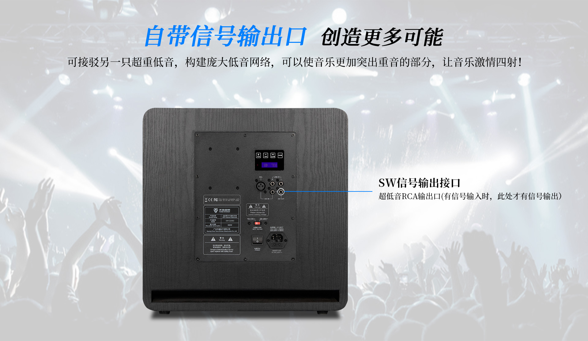 簡介:SW-D2000是專門為低頻愛好者打造的一款大功率有源超重低音音箱。采用12英寸長沖程、大功率、低失真的喇叭單元配合高效低噪的D類放大電路,峰值可達2000W,內置DSP數字處理器,7段參量均衡;配合雙導流、下潛反射式倒相口,具有低頻強勁有力,下潛深等特點;采用觸摸按鍵配合液晶顯示屏,且支持手機APP無線控制;使整機調校操作更方便。