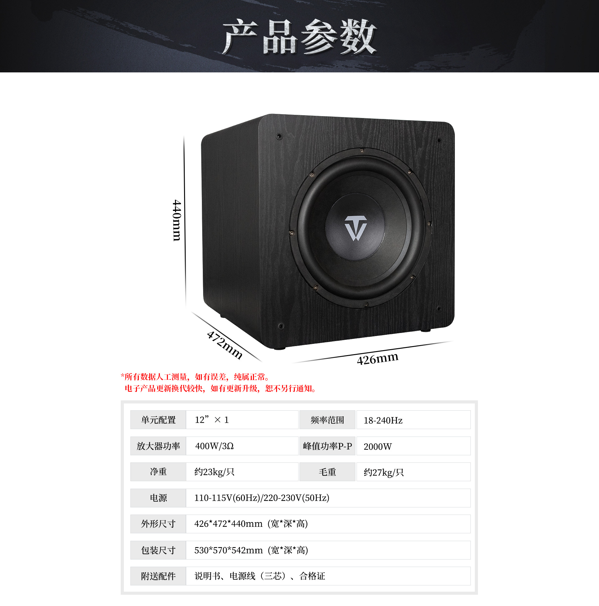 | 頻率范圍:18-240Hz | 放大器功率:400W |
