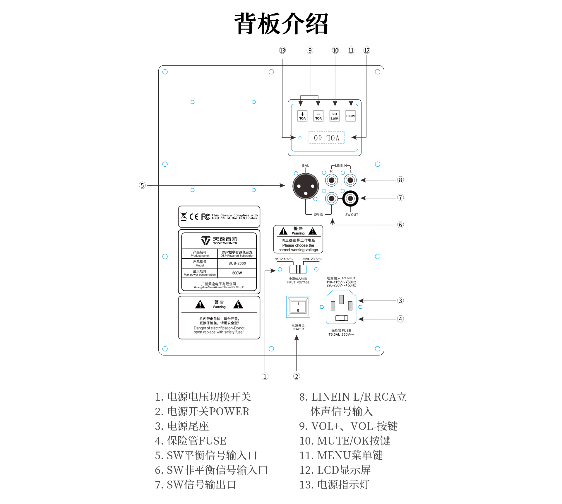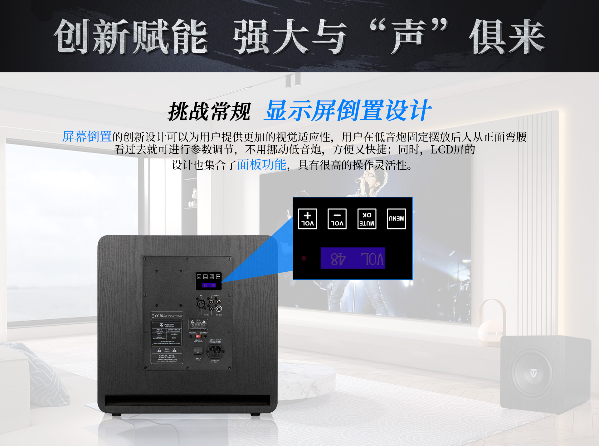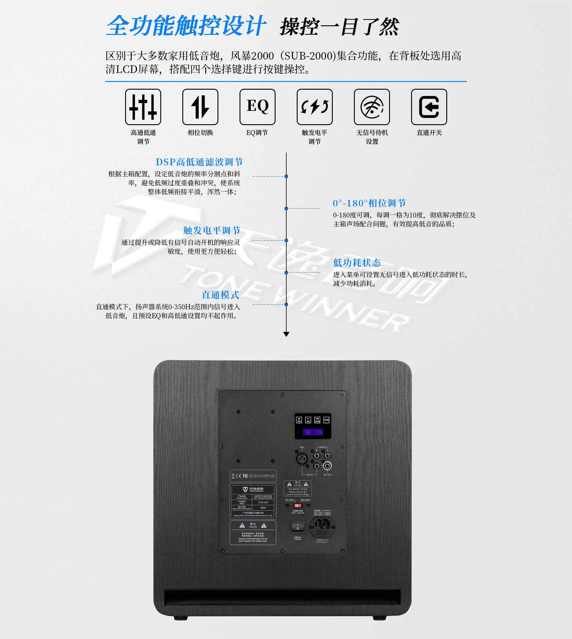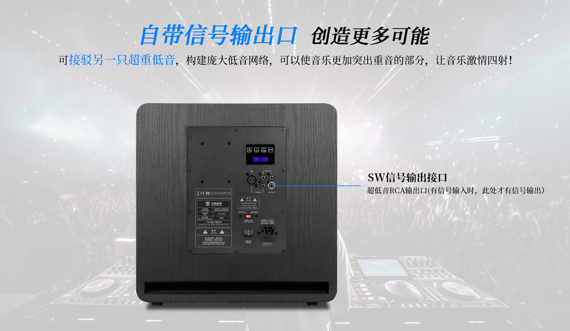一、功能特點1、采用高效低噪D類放大電路,內置DSP數字處理器,7段參量均衡 (EQ) 任意調節 2、采用觸摸按鍵配合液晶顯示屏,調校一目了然; 3、實現APP遠程控制,操作更便捷; 4、實現APP無線操作程序升級; 5、內置低通濾波器,頻率范圍可調節; 6、內置相位開關,0°/180°相位切換; 7、支持平衡、RCA兩種輸入; 8、支持無信號待機功能; 9、12英寸、長沖程、強磁、大功率喇叭單元,具有低失真、高動態長沖程等特點; 10、雙導流、下潛反射式倒相口, 強勁有力,低頻更足。