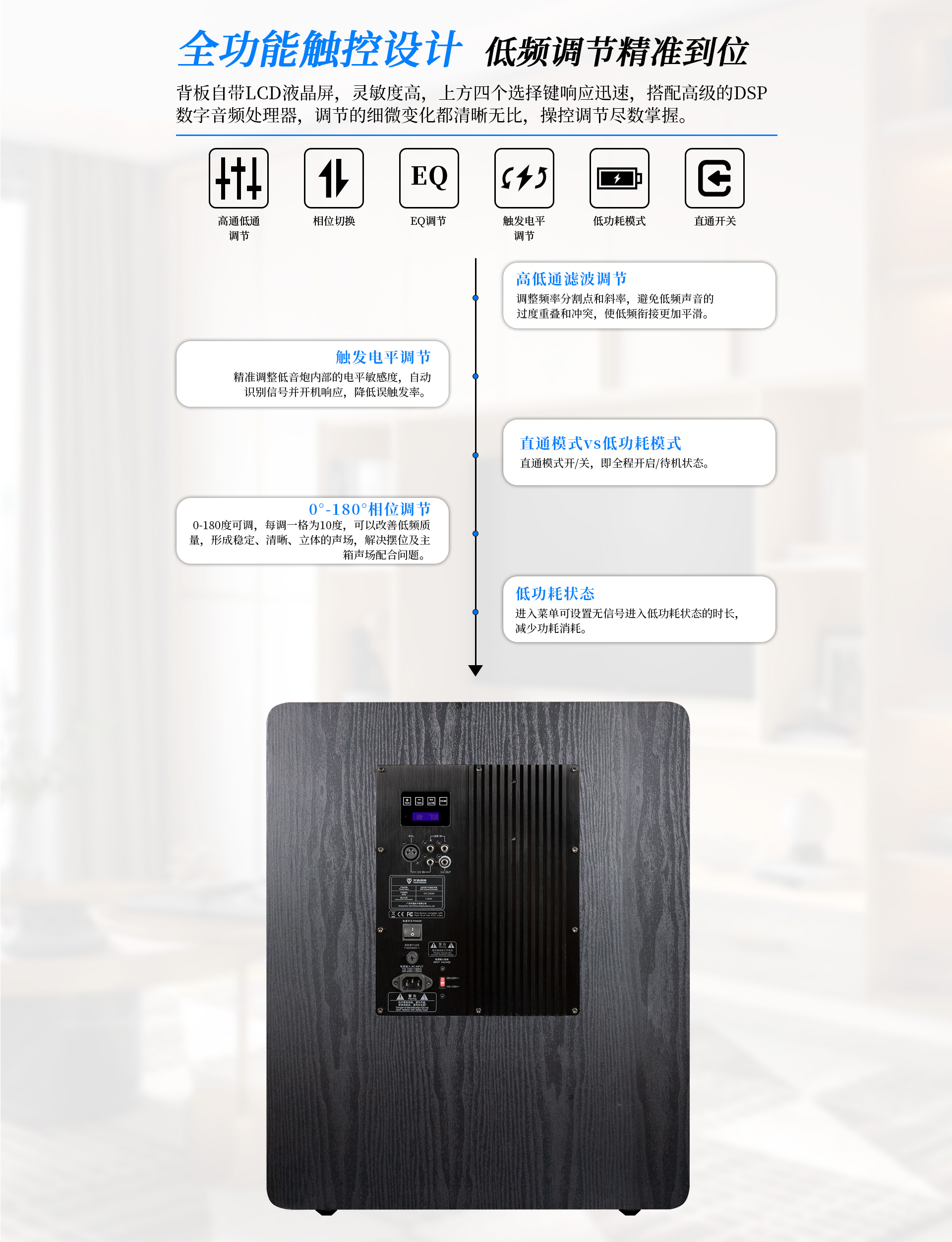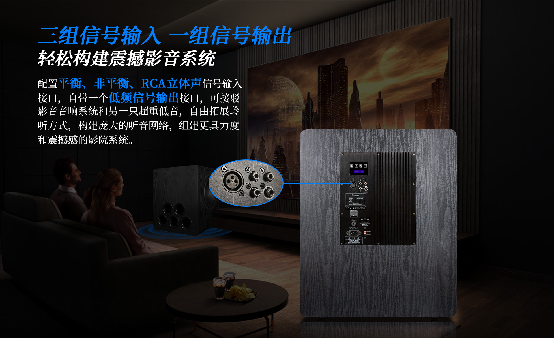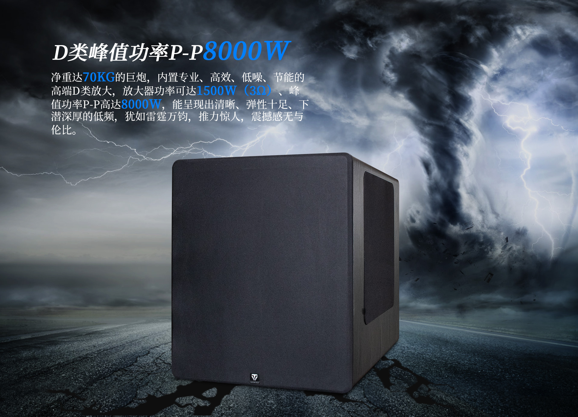 簡介:SW-D8000是天逸全新推出的一款旗艦級雙15寸有源低音炮,它采用兩個15寸的大口徑、低失真、長沖程、大動態的喇叭單元,下潛深不見底。整體總重量更是達到了68公斤!峰值功率P-P達8000W(3Ω),低頻質感豐厚,細節滿滿。采用雙磁鋼設計,大功率輸出的低頻更加飽滿清晰。背板采用觸摸按鍵配合液晶顯示屏,支持手機APP無線控制,四種低頻模式,多種DSP處理效果。整機調校方便、功能強大,是家庭影院和音樂愛好者的首選。