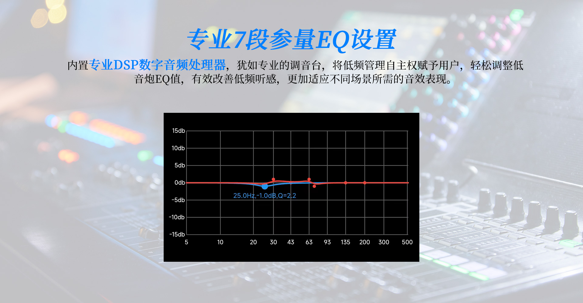 1. 采有高效低噪D類放大電路內置DSP數字處理器,7段參量均衡(EQ) 任意調節