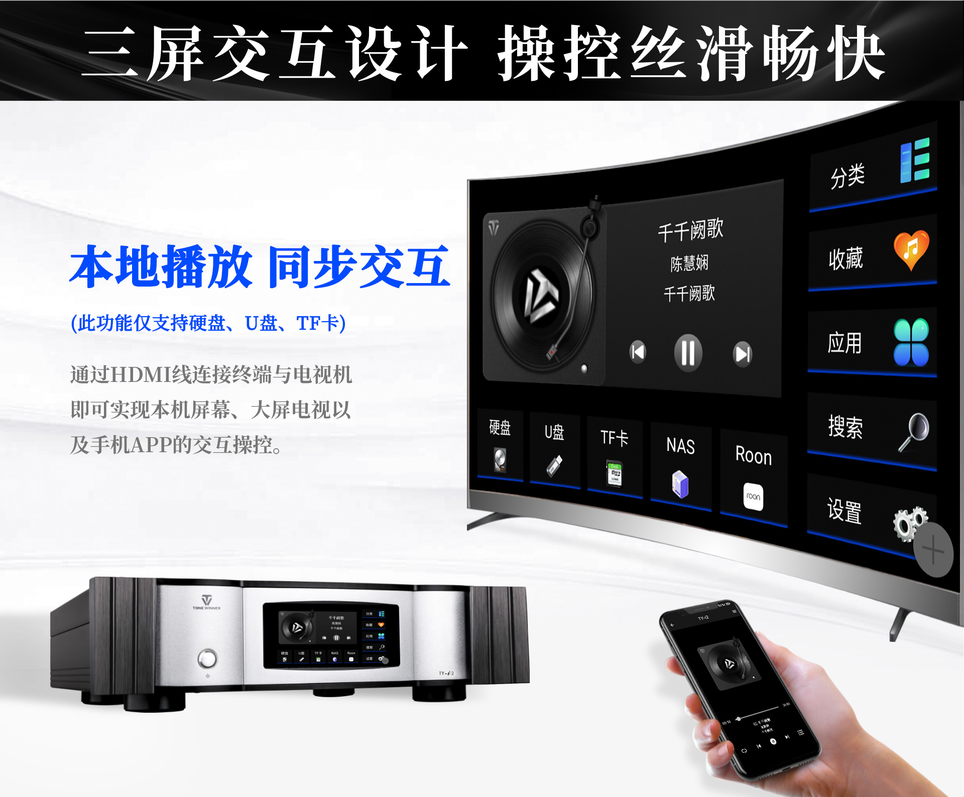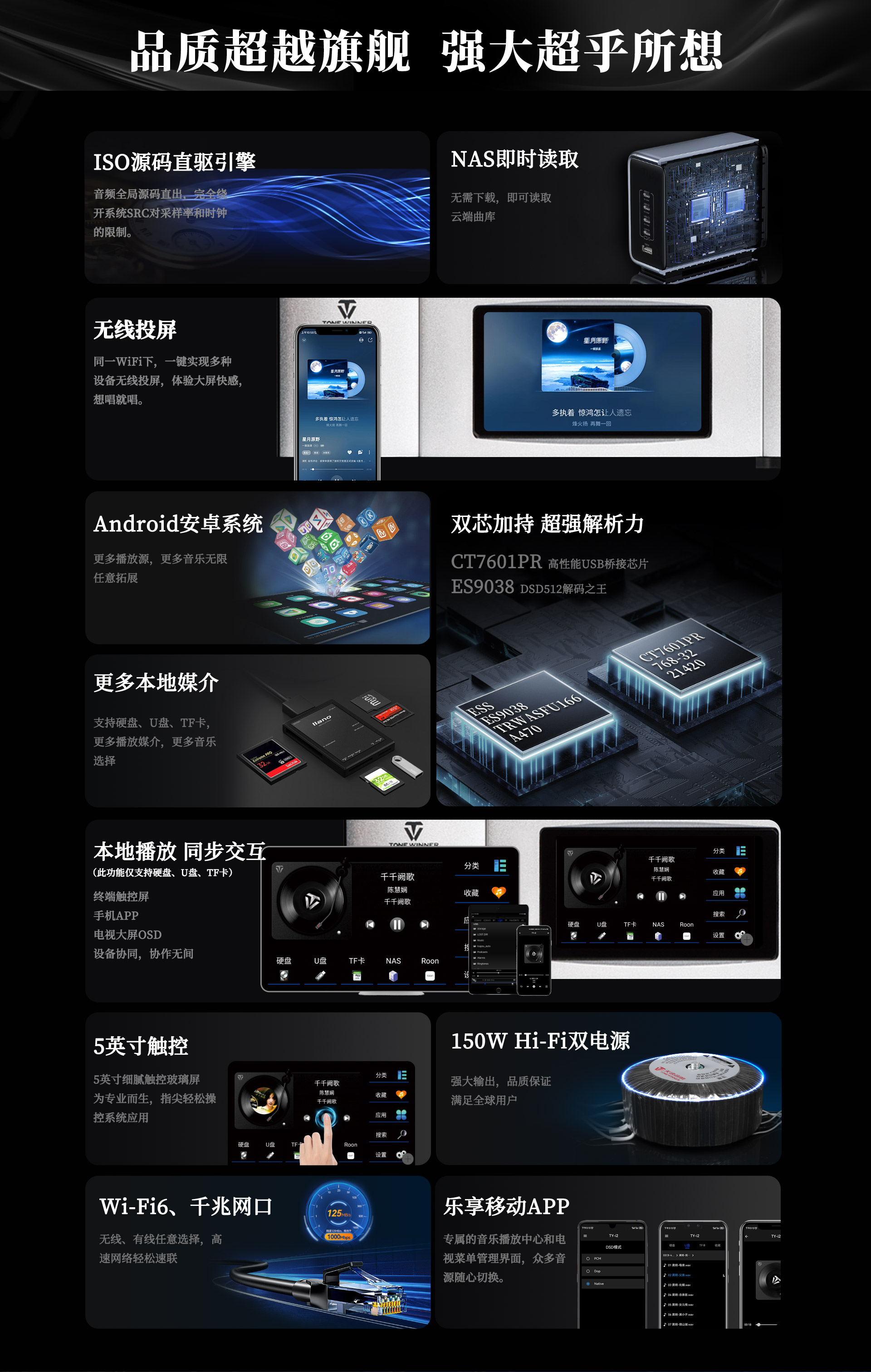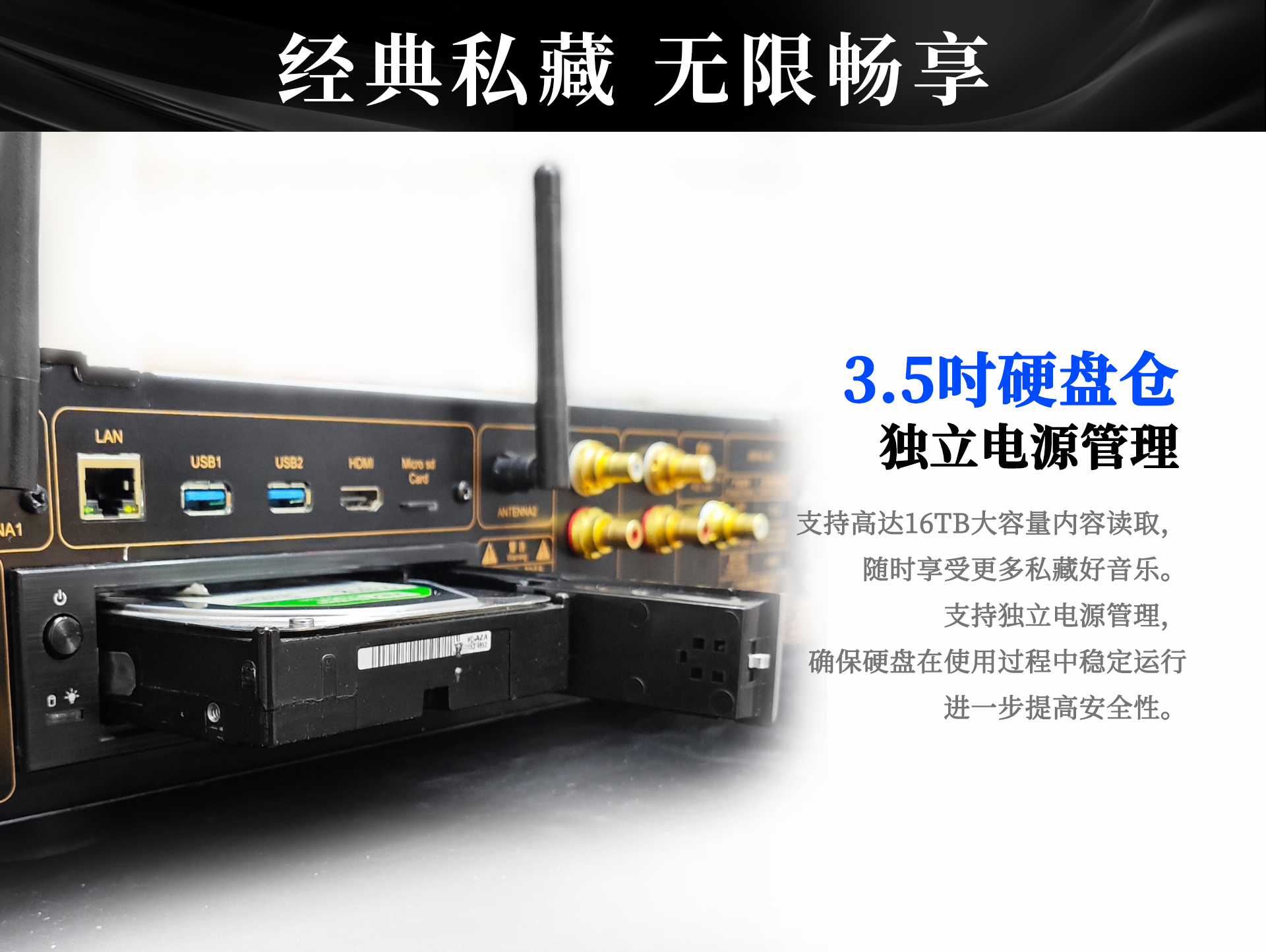 三、功能特點 1. 音頻全局源碼直出,完全繞開系統SRC對采樣率和時鐘的限制; 2.支持16T HDD硬盤、4T移動硬盤、2T U盤、2T TF卡本地播放; 3. 支持千兆以太網,支持WiFi6高速傳輸,及應用在線下載; 4. 支持NAS服務器訪問與播放,支持SMB協議,支持局域網共享音樂播放; 5.支持無線投屏推送功能; 6.支持DSD(DSF、DFF、DIFF最高至512)、MP3、APE、WAV、FLAC、AIFF、SACD、CUE、DTS; 7. 支持手機APP操控,支持紅外遙控; 8. 支持HDMI連接至大屏電視同步顯示; 9. 支持機器觸控屏、手機APP、電視搭載遙控三頻互聯; 10. 支持掃描本地歌曲,根據專輯、歌手、風格等進行分類,可建立個人收藏文件夾,對海量音樂進行管理; 11. 支持系統在線升級與USB升級。