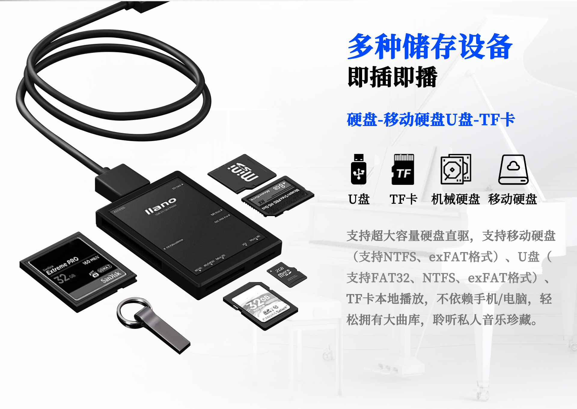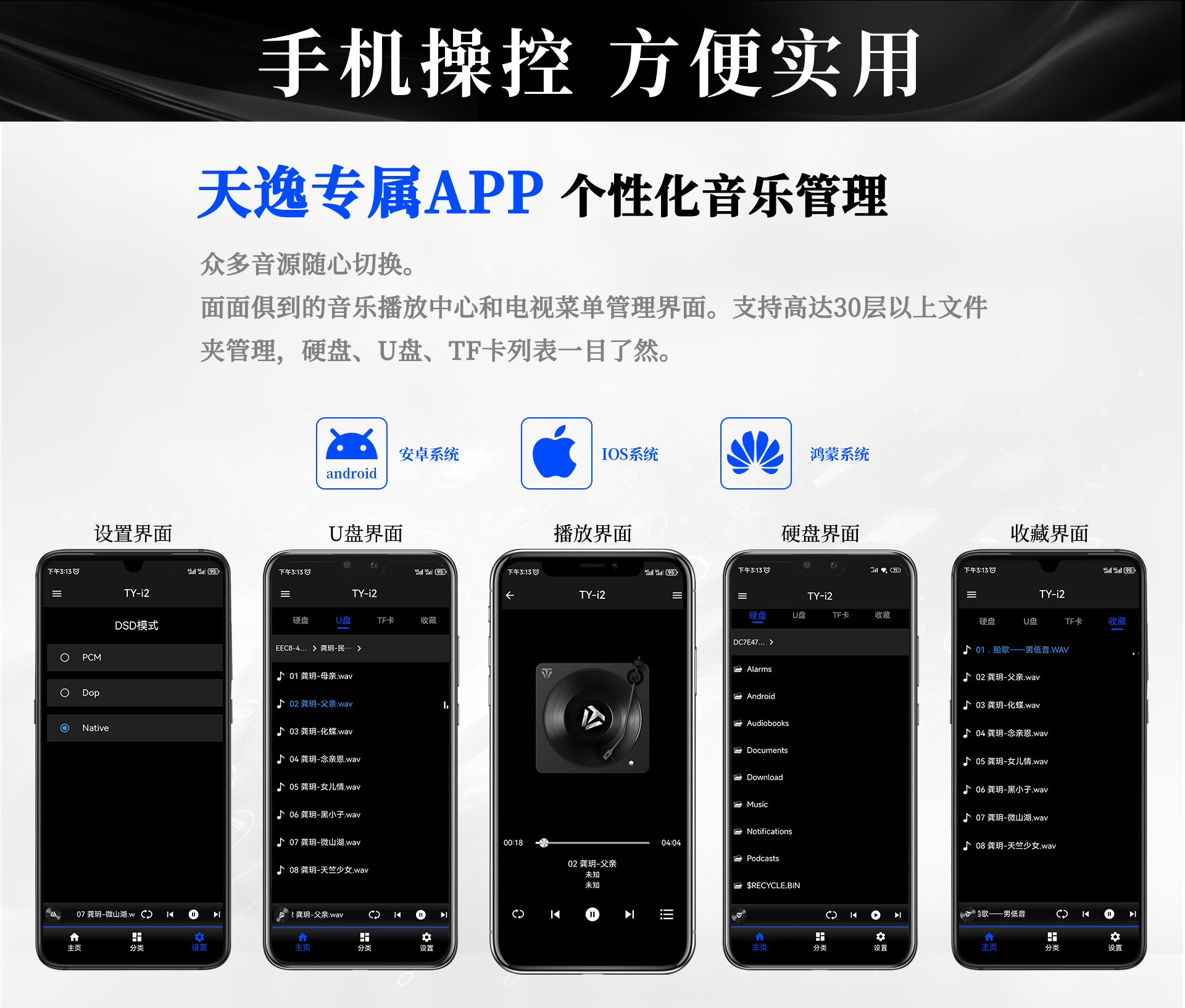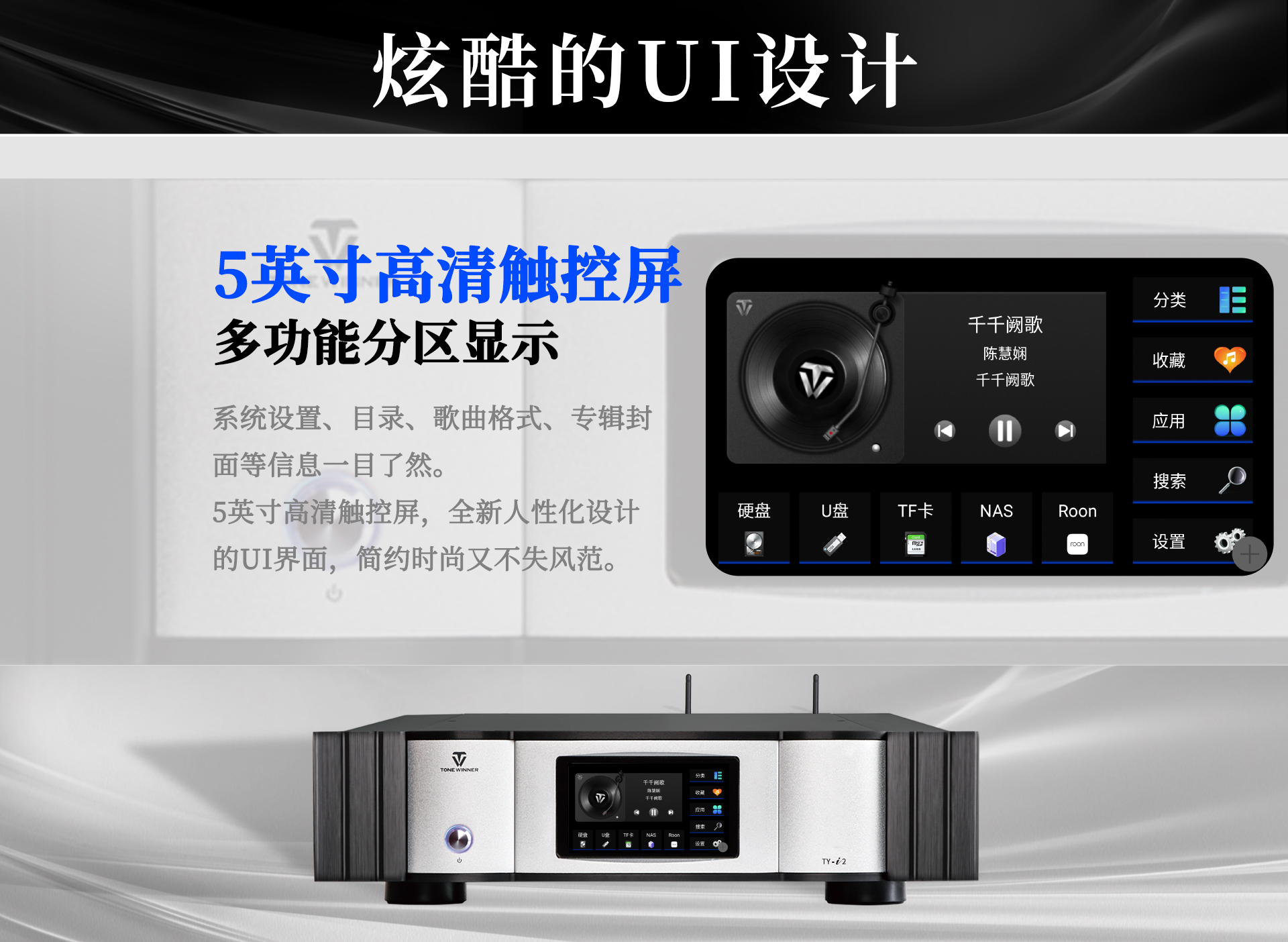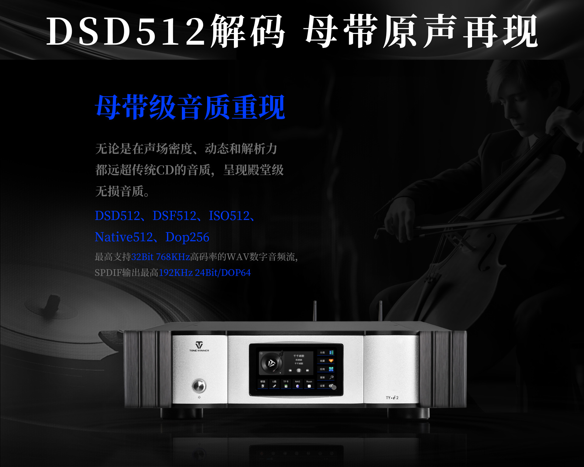 三、功能特點 1. 音頻全局源碼直出,完全繞開系統SRC對采樣率和時鐘的限制; 2.支持16T HDD硬盤、4T移動硬盤、2T U盤、2T TF卡本地播放; 3. 支持千兆以太網,支持WiFi6高速傳輸,及應用在線下載; 4. 支持NAS服務器訪問與播放,支持SMB協議,支持局域網共享音樂播放; 5.支持無線投屏推送功能; 6.支持DSD(DSF、DFF、DIFF最高至512)、MP3、APE、WAV、FLAC、AIFF、SACD、CUE、DTS; 7. 支持手機APP操控,支持紅外遙控; 8. 支持HDMI連接至大屏電視同步顯示; 9. 支持機器觸控屏、手機APP、電視搭載遙控三頻互聯; 10. 支持掃描本地歌曲,根據專輯、歌手、風格等進行分類,可建立個人收藏文件夾,對海量音樂進行管理; 11. 支持系統在線升級與USB升級。