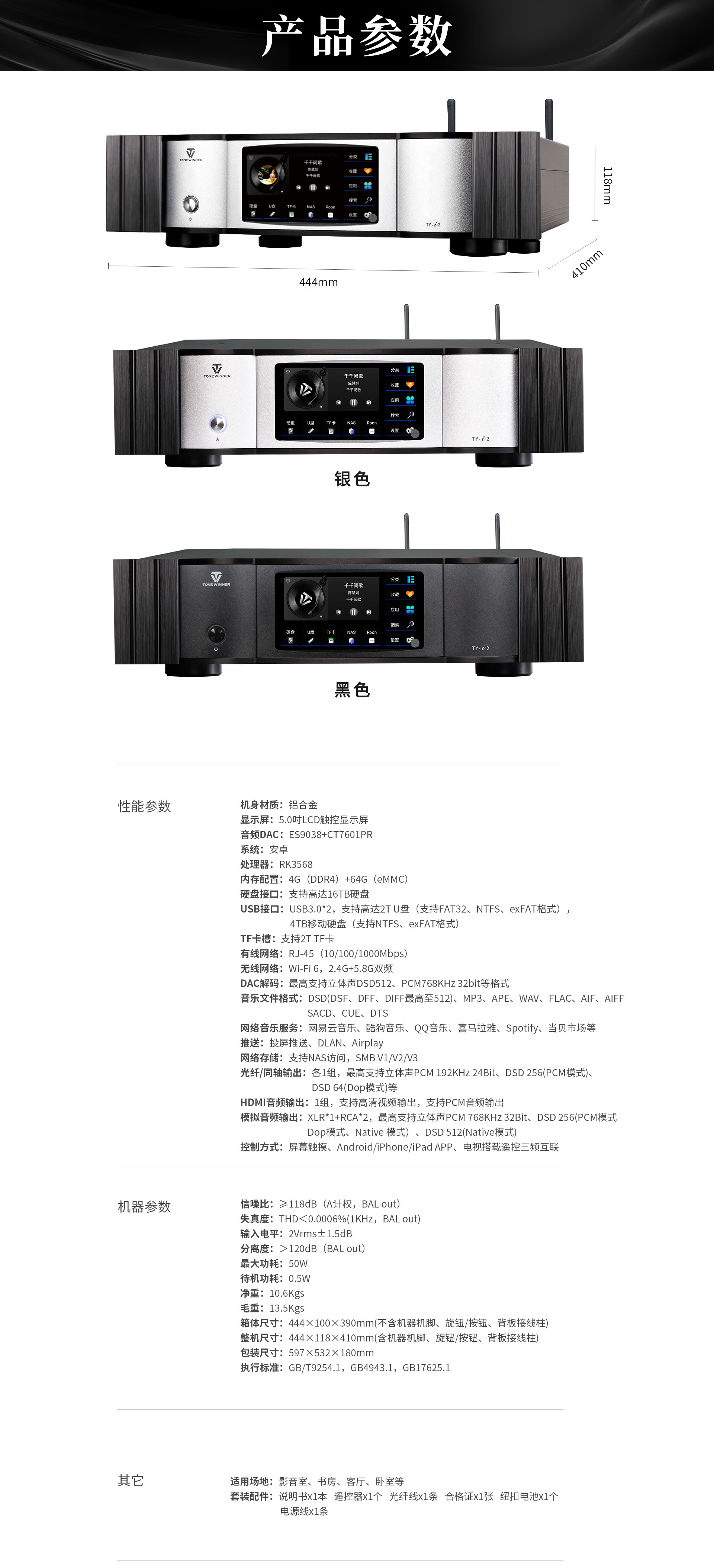 二、用料及電路設計 1、安卓系統,搭載瑞芯微RK3568輕量級人工智能芯片,集成4核arm架構A55處理器和Mali G52 2EE圖形處理器,可以下載全球各種應用; 2、采用高性能USB橋接芯片CT7601PR,搭載發燒頂級解碼芯片ES9038,使得解碼部分動態范圍達到129dB,總失真度低至-120dB,支持高達32bit/768kHz的PCM和DSD512的高規格音樂文件。 3、飛秒級高精度時鐘,有效抑制抖動,盡顯音頻的超高動態與細節表現; 4、150W超大電源變壓器,發燒級模擬線性電源,提供穩定、可靠且純凈的聲音動力源泉。 5、專用全平衡Hi-Fi電路,高保真XLR模擬信號輸出,為整機提供更好的抗噪性。 6、TY-i2接口均采用24K鍍金端子,能減少金屬接觸面的微動腐蝕,進而減少接觸電阻,增加電流導通性,同時能有效增強信號傳輸的穩定性和完整性。