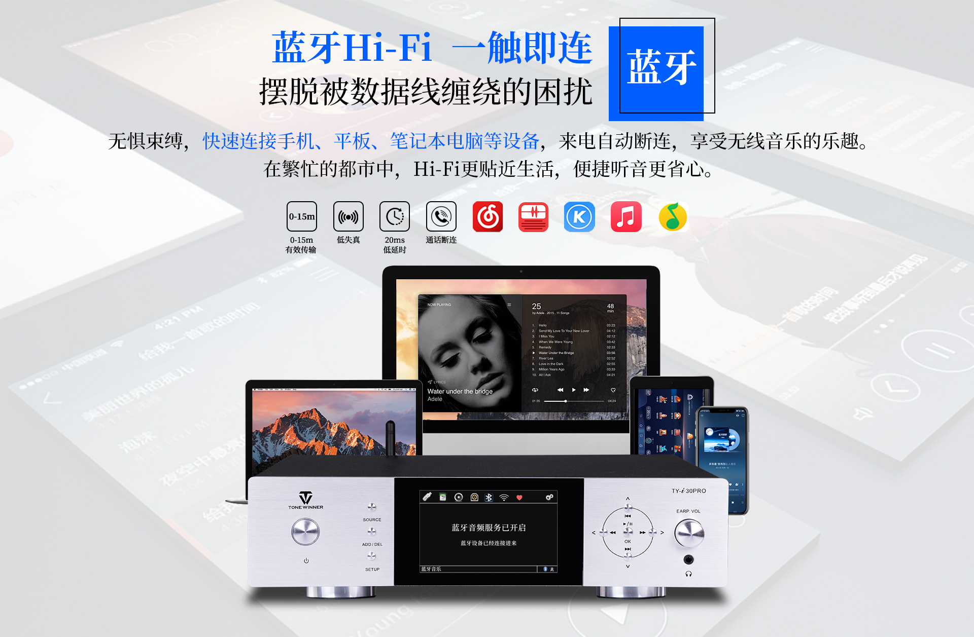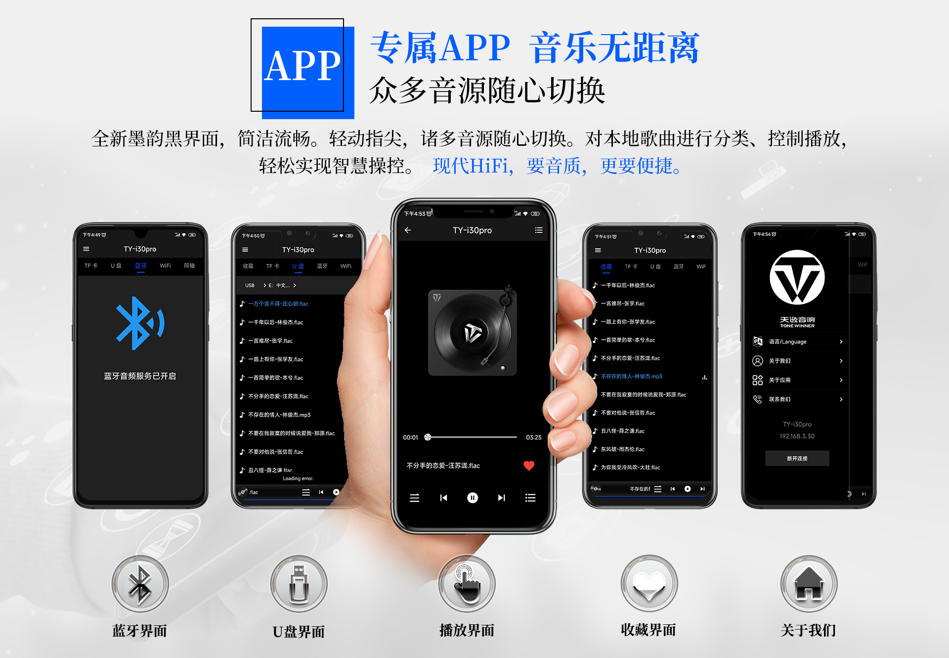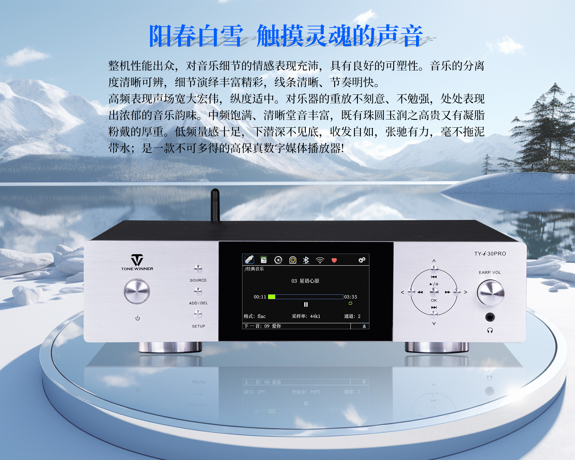 作為一款高保真無線數字播放器,TY-i30PRO的音樂表現力十分出色。它的聲音平衡又立體,諸多細節經過精細的解碼得以還原。其低頻厚實、中音柔順溫暖、高音干凈利落,層次感極好,無論是古典樂,還是電子音樂都能完美詮釋。