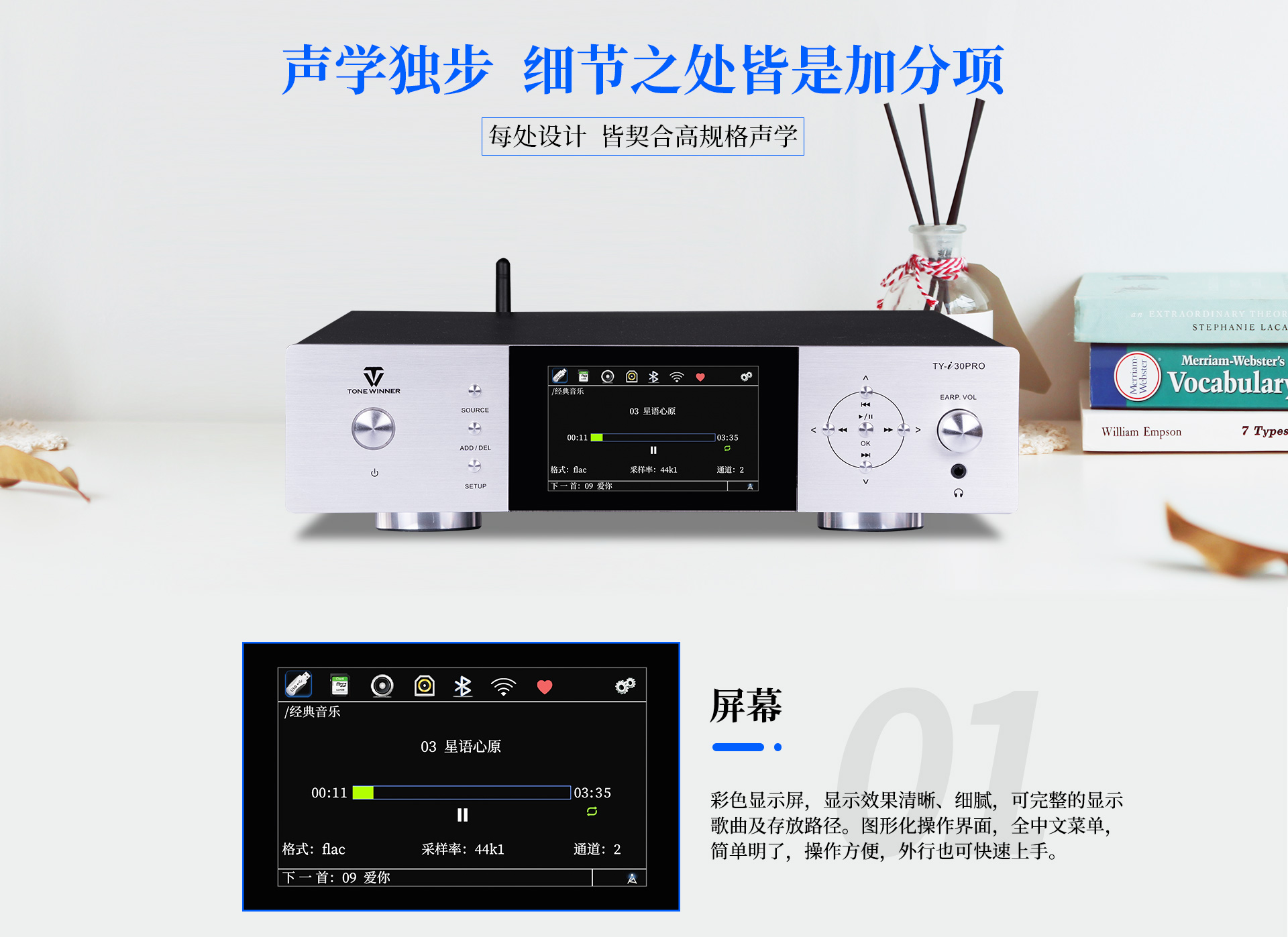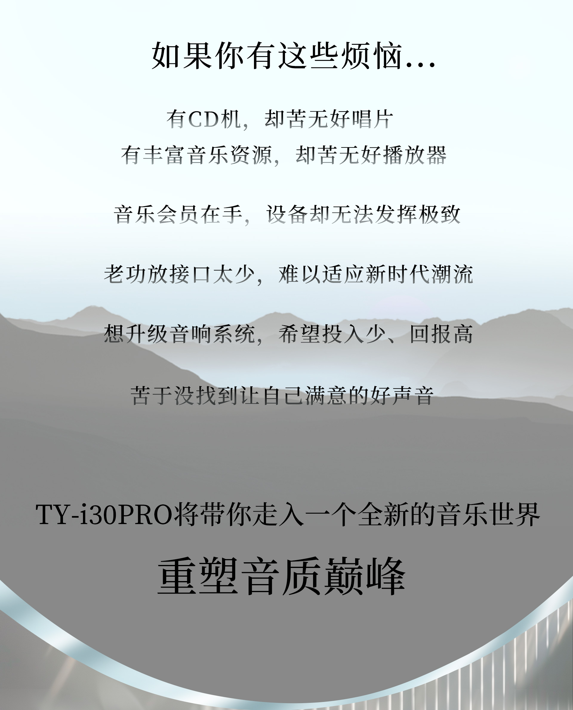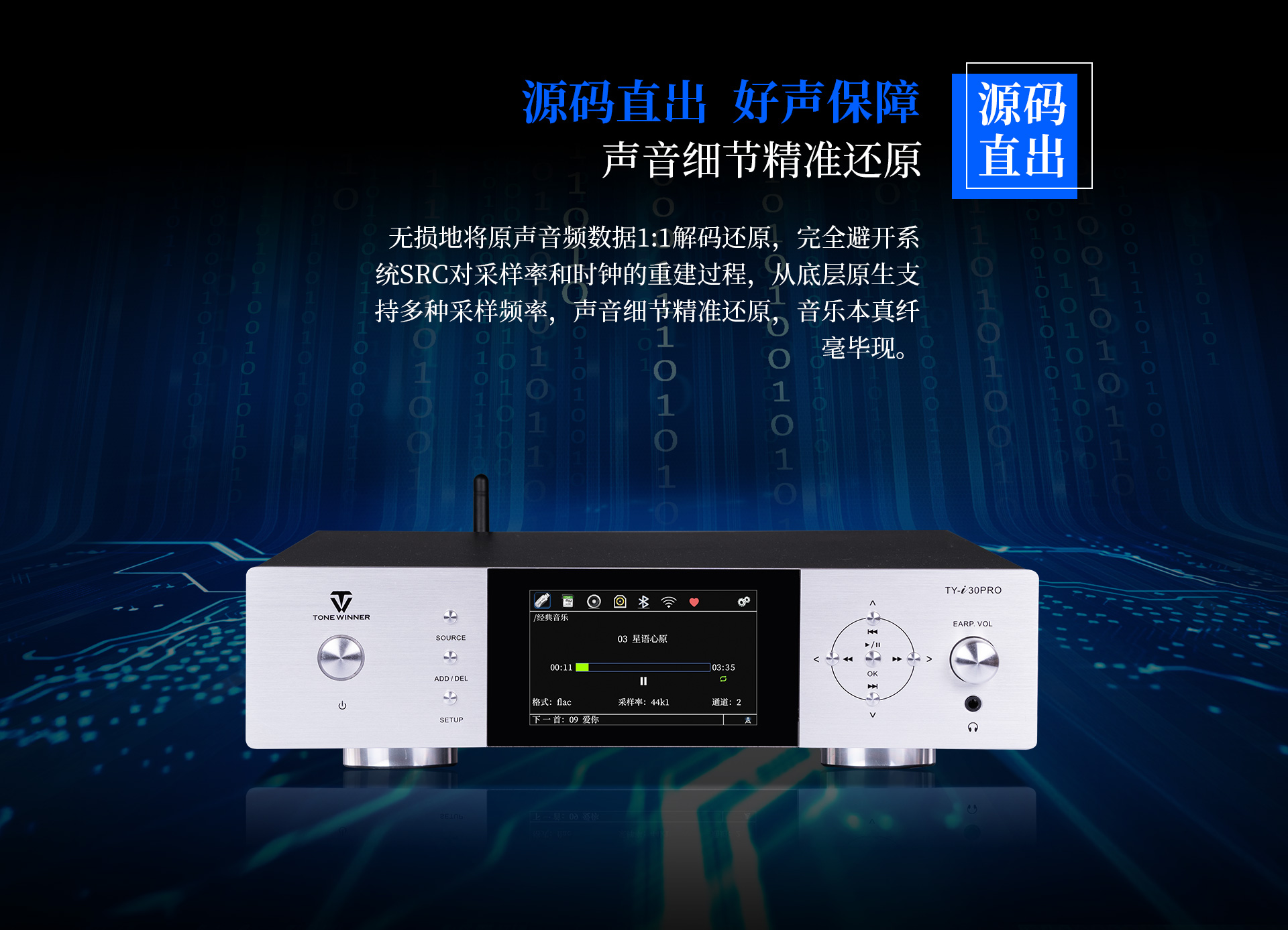 作為一款高保真無線數字播放器,TY-i30PRO的音樂表現力十分出色。它的聲音平衡又立體,諸多細節經過精細的解碼得以還原。其低頻厚實、中音柔順溫暖、高音干凈利落,層次感極好,無論是古典樂,還是電子音樂都能完美詮釋。