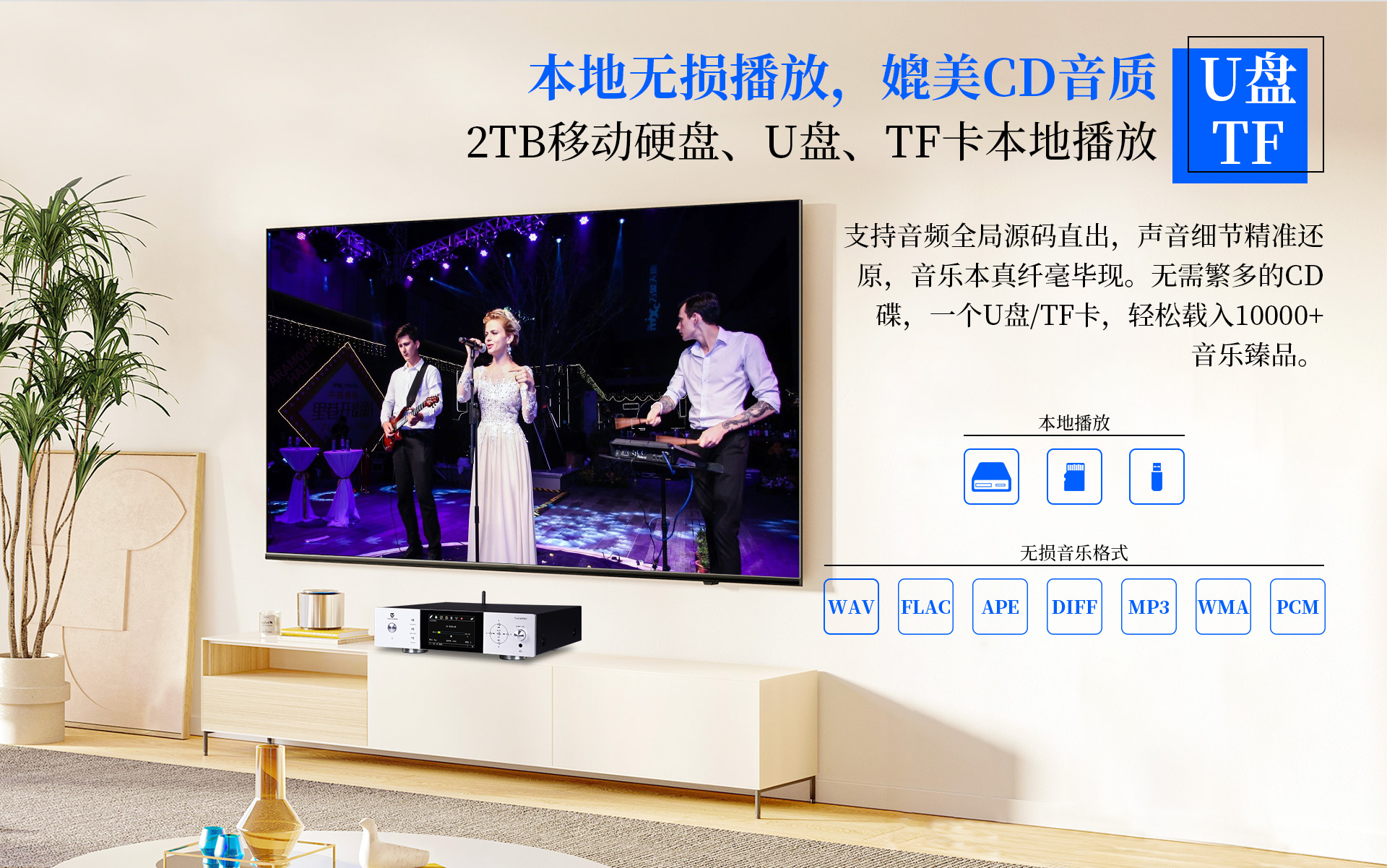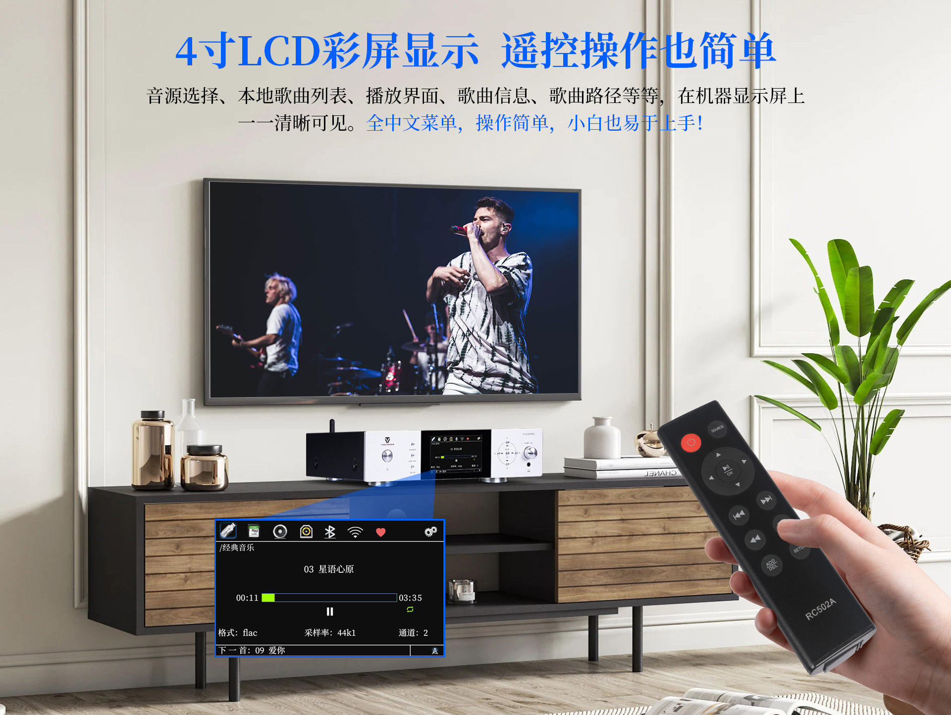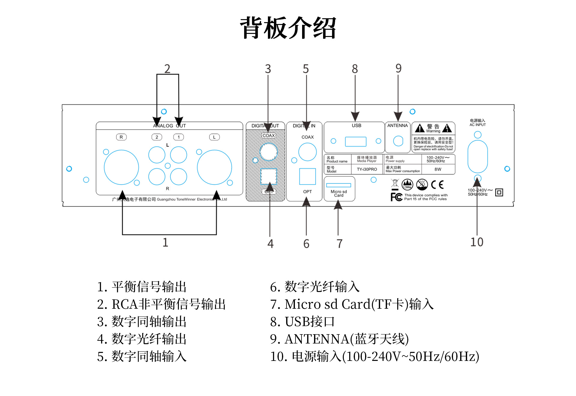 三、功能概述 1、 一組USB-Audio輸入、一組光纖、一組同軸; 2、 模擬輸出:一組平衡,二組非平衡; 3、 支持2TB移動硬盤、U盤、TF卡本地播放,支持WAV、FLAC、AFE等無損音樂信號; 4、 前置3.5mm耳機孔,即插即聽; 5、 支持Wi-Fi無線傳輸; 6、 支持藍牙無線連接,傳輸高速、低損耗、穩定,暢享海量音樂曲庫; 7、 全新APP連接,九層文件夾管理,諸多音源集中管理,配合遙控器控制,方便快捷;