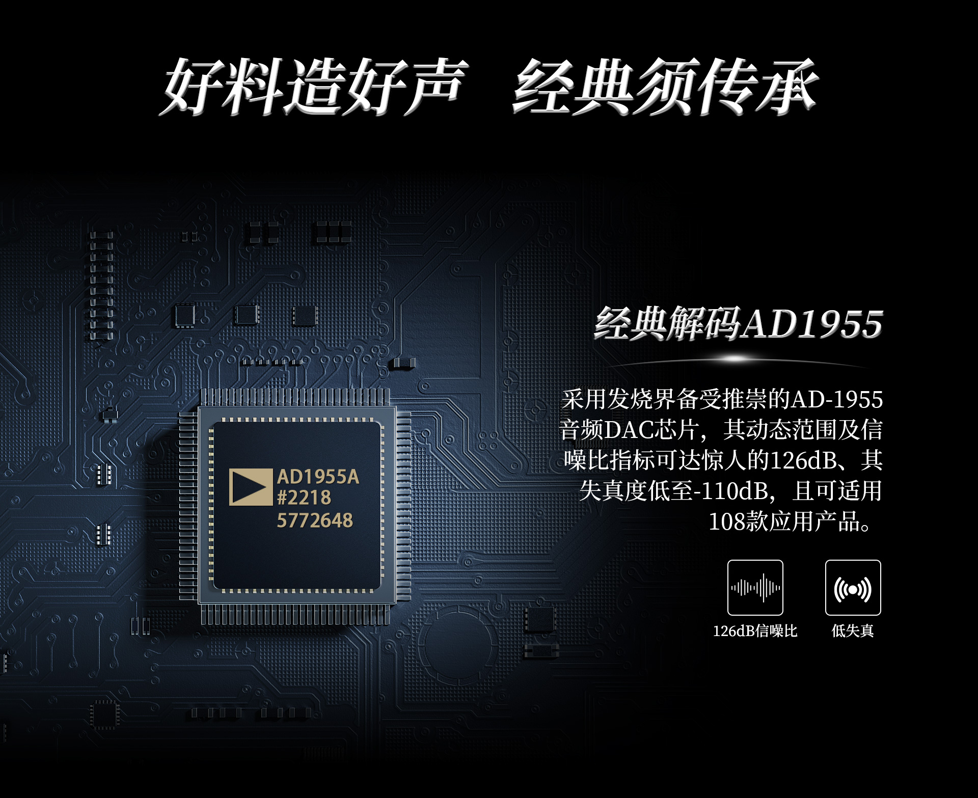二、 用料及電路設計 TY-i30PRO解碼的用料相當講究,精選多種高端器件,采用了經典的解碼芯片AD-1955,支持24bit/192KHz音頻數碼流輸入,信噪比達126dB; 數字音頻接收芯片選用美國Cirrus logic公司的CS8416;運算放大器采用美國TI公司的高端發燒運放OPA2134。