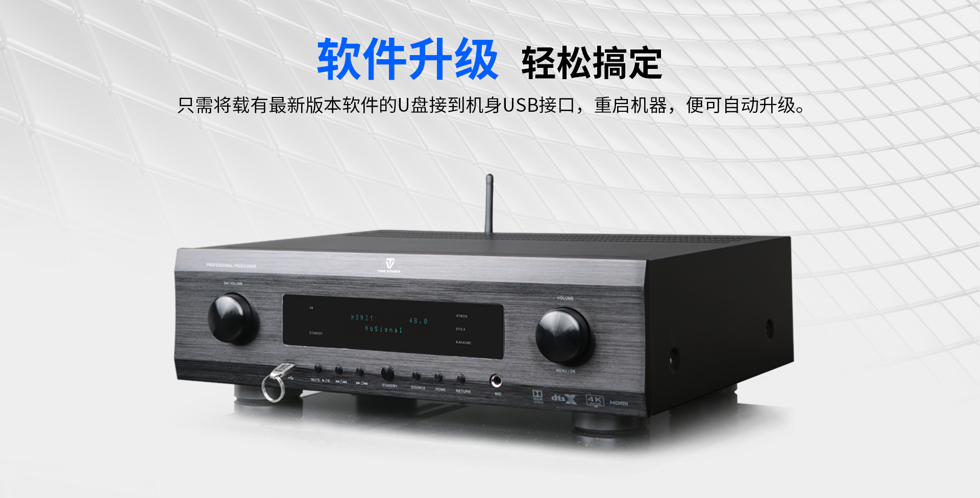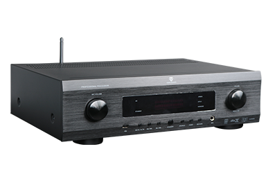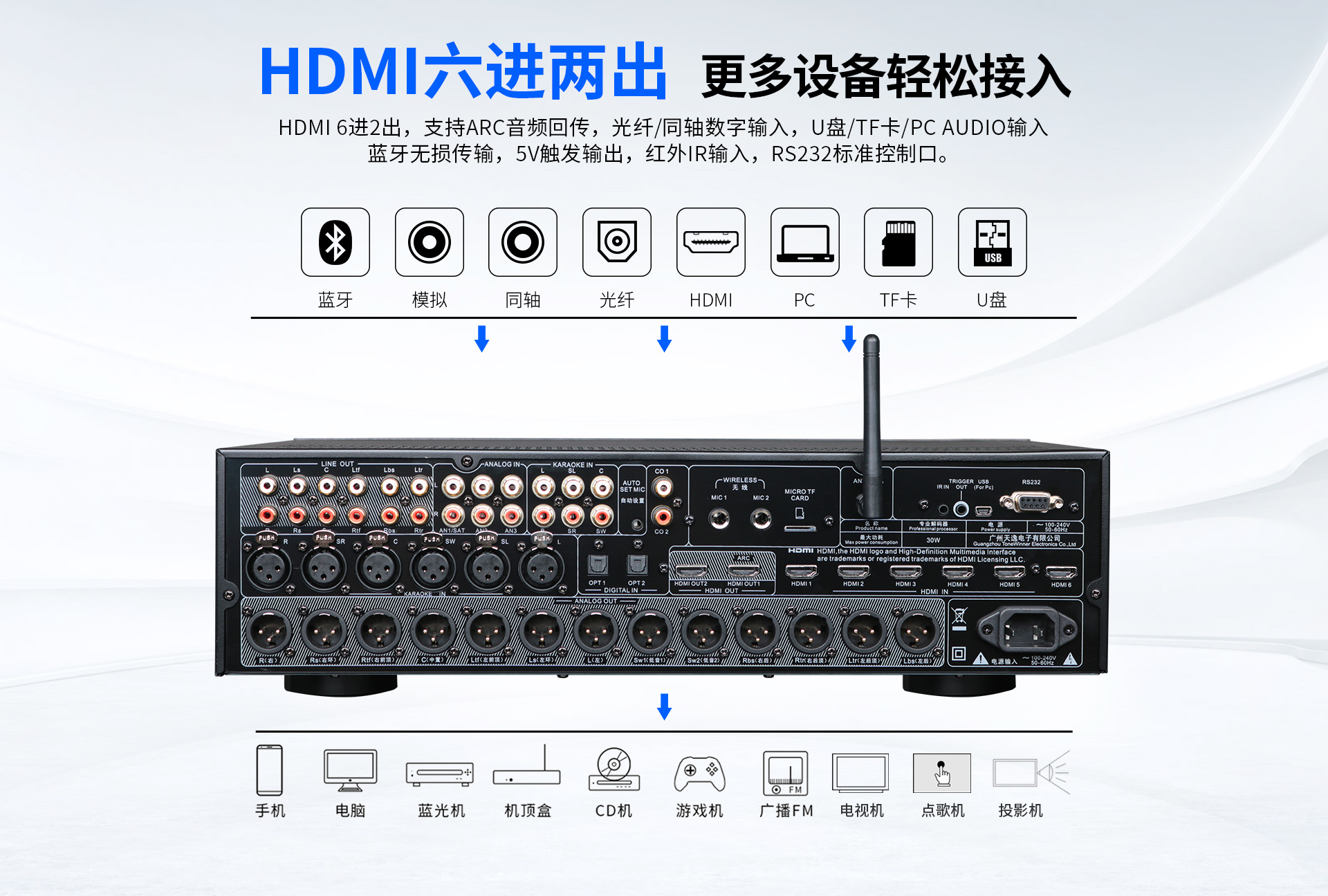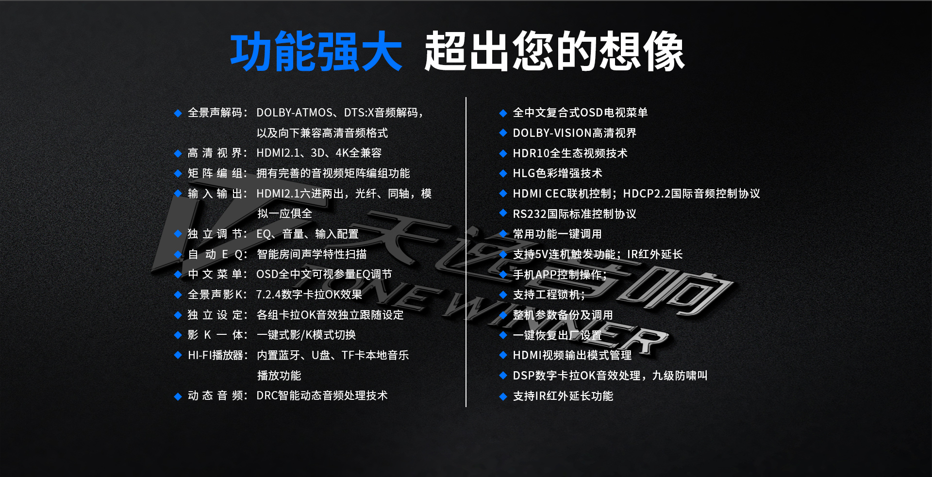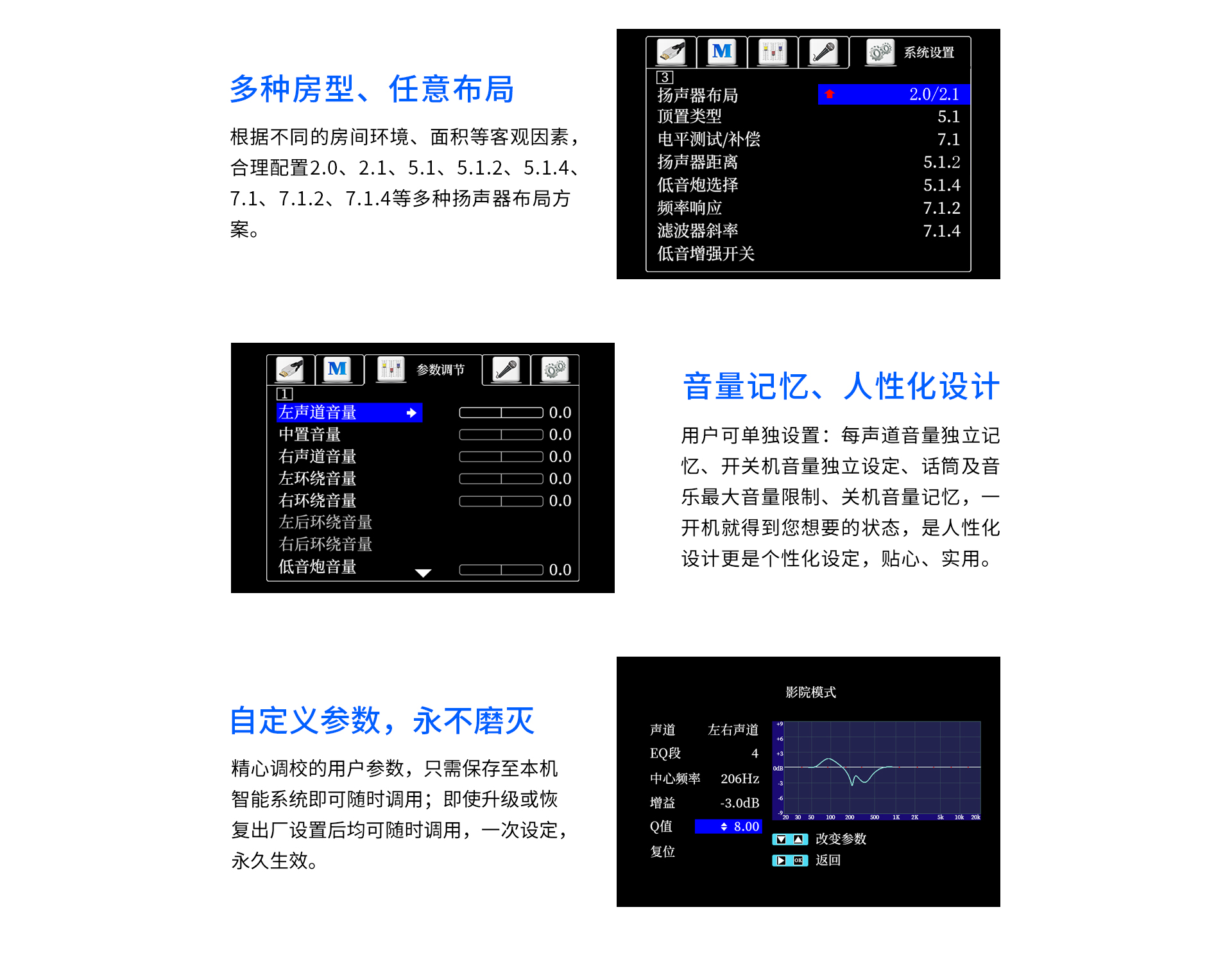 二、功能特點 1.支持Dolby Atmos、Dolby True-HD及向下兼容所有杜比音頻編碼文件; 2.支持DTS:X、DTS-Master及向下兼容所有DTS音頻編碼文件; 3.支持HDMI 2.1,支持HDCP2.2; 4.支持4K/60Hz,RGB4:4:4,18GHz全帶寬高清視頻信號; 5.支持Dolby Vision及HDR 10高清視頻信號; 6.多達12聲道的杜比全景聲7.1.4全平衡輸出; 7.內置7.2.4全景聲卡拉OK系統,強大的DSP數字混響效果及九級防嘯叫移頻處理技術,多種人聲風格選擇; 8.房間EQ、揚聲器距離、延時、聲壓的自動測試及補償,一鍵式操作,全自動校正,同時支持用戶手動調節; 9.內置藍牙數字聲場接收器; 10.內置高品質音樂播放器,支持TF卡及U盤音頻文件播放,支持FLAC、APE、WAV、MP3等多種無損及有損壓縮音頻格式,支持多層文件夾管理; 11.支持手機APP操作; 12.全中文音視頻疊加式OSD屏幕顯示菜單; 13.支持本地音樂信息可同步讀取顯示; 14.支持從2.0聲道到7.1.4聲道等10多種揚聲器配置; 15.支持HDMI 6進2出,2組同軸2組光纖數碼音頻輸出,3組模擬音頻輸入; 16.支持5.1聲道外部混音輸入,可外接混響器; 17.支持RS232集中控制器; 18.支持HDMI ARC音頻回傳,支持CEC控制; 19.支持高達1000ms時長的唇音同步調節; 20.每聲道多達5~11段參數EQ; 21.支持音視頻編組輸出; 22.選用美國ADI新一代雙核DSP處理器; 23.支持按輸入源獨立設置及保存參數的功能; 24.輸入源獨立EQ選擇,獨立卡拉OK控制,獨立音量調節記憶; 25.支持話筒音量及音樂音量的開機設置和最大音量限制; 26.支持5V連機觸發功能; 27.支持IR紅外延長功能。