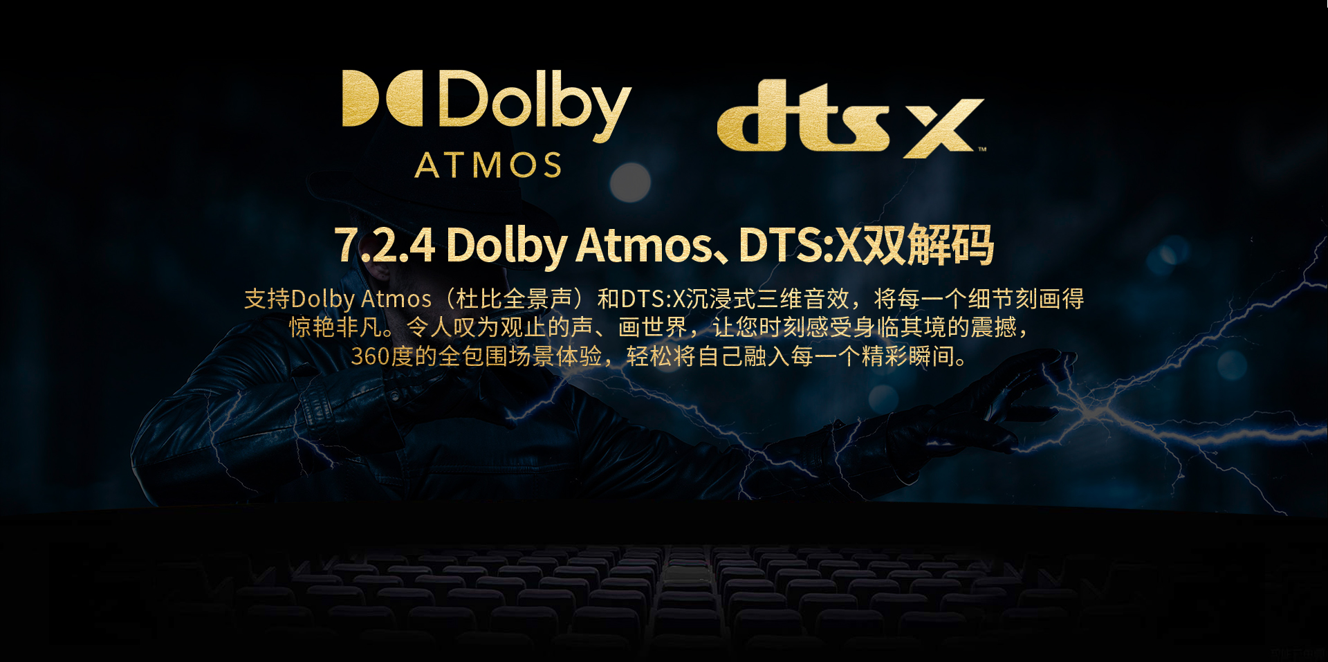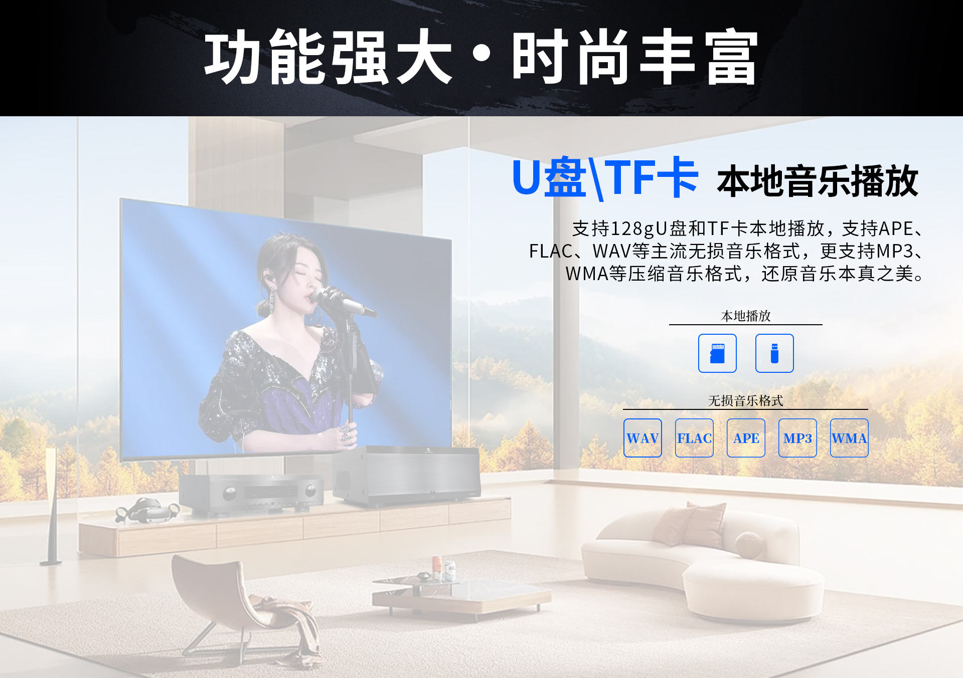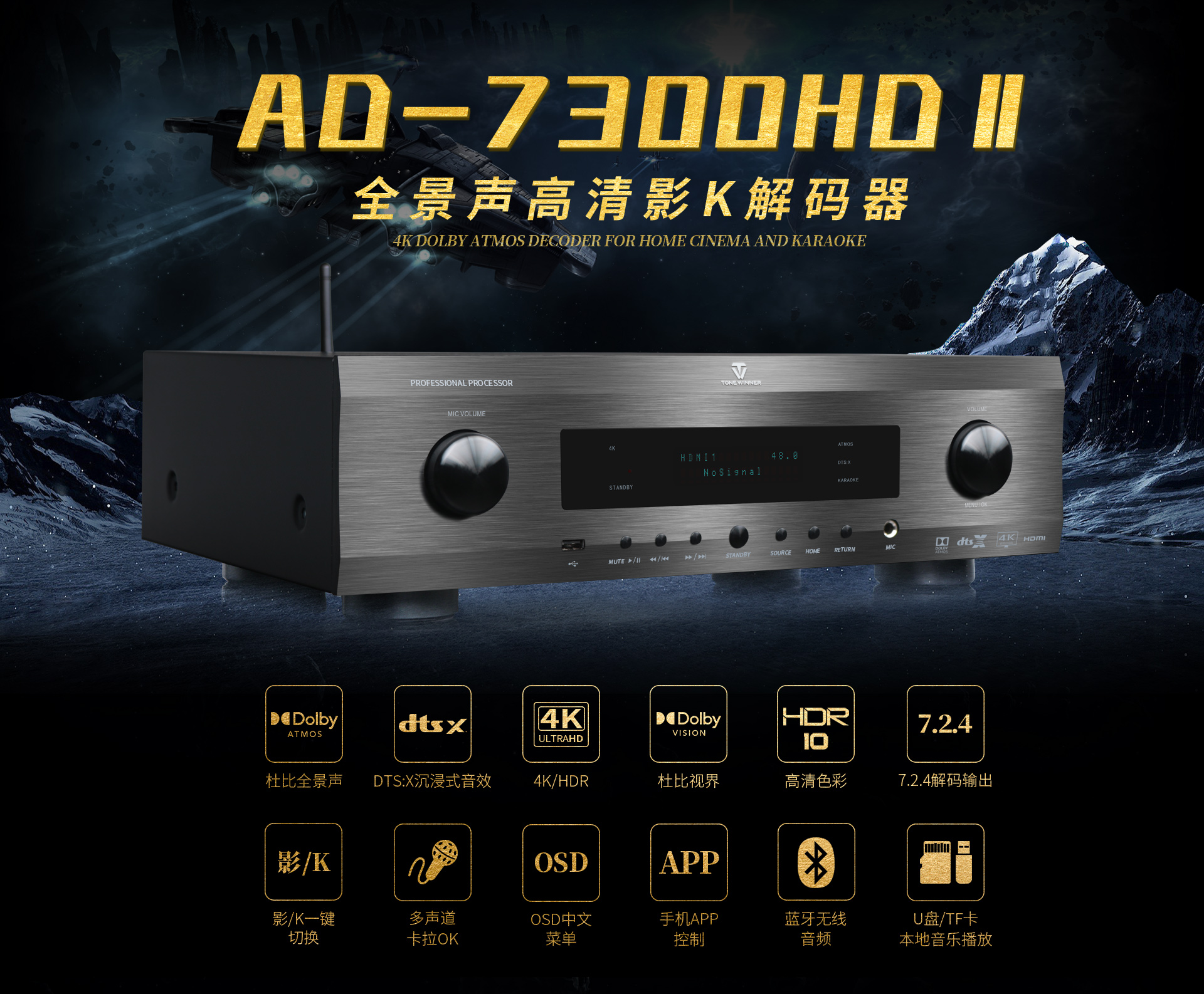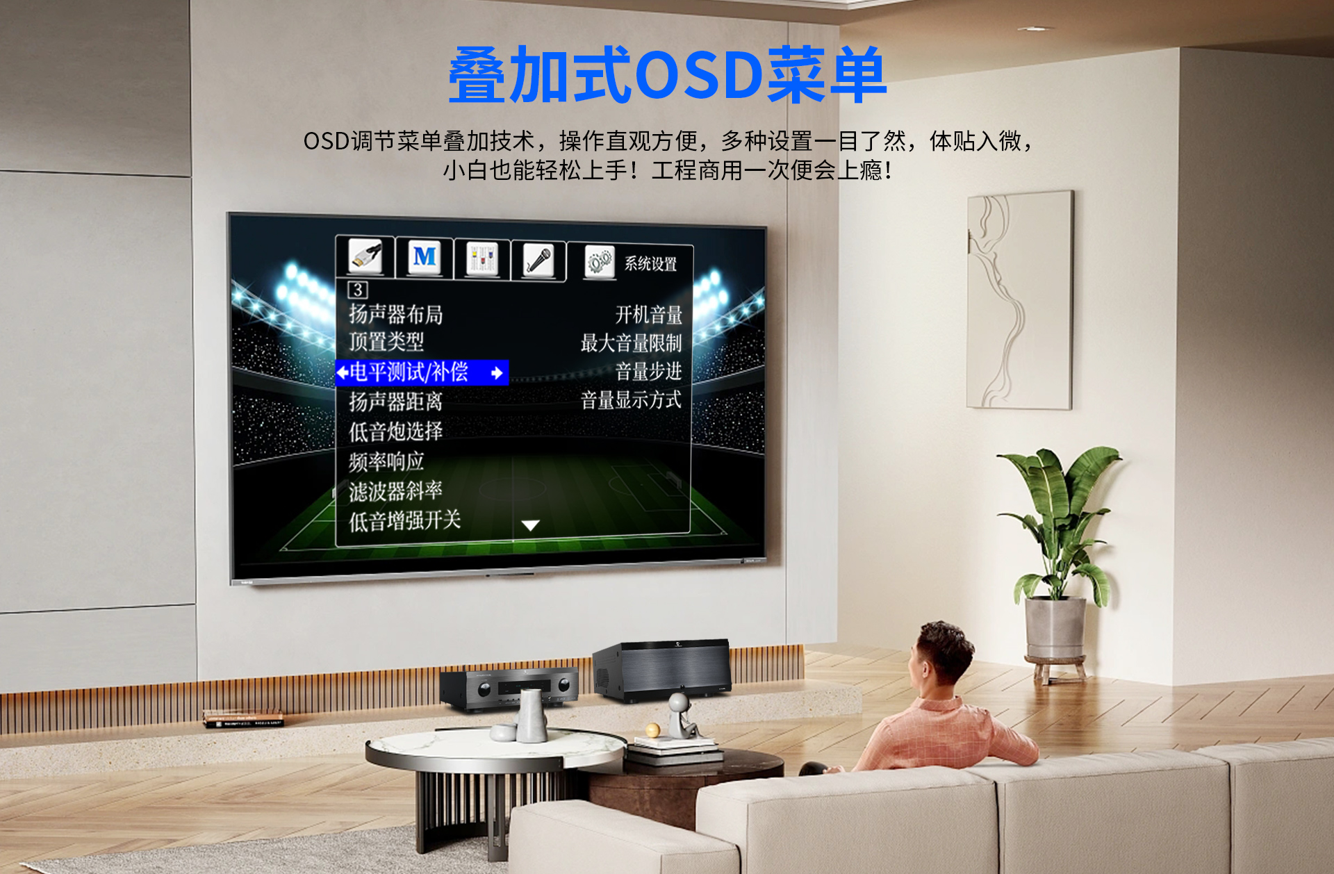 二、功能特點 1.支持Dolby Atmos、Dolby True-HD及向下兼容所有杜比音頻編碼文件; 2.支持DTS:X、DTS-Master及向下兼容所有DTS音頻編碼文件; 3.支持HDMI 2.1,支持HDCP2.2; 4.支持4K/60Hz,RGB4:4:4,18GHz全帶寬高清視頻信號; 5.支持Dolby Vision及HDR 10高清視頻信號; 6.多達12聲道的杜比全景聲7.1.4全平衡輸出; 7.內置7.2.4全景聲卡拉OK系統,強大的DSP數字混響效果及九級防嘯叫移頻處理技術,多種人聲風格選擇; 8.房間EQ、揚聲器距離、延時、聲壓的自動測試及補償,一鍵式操作,全自動校正,同時支持用戶手動調節; 9.內置藍牙數字聲場接收器; 10.內置高品質音樂播放器,支持TF卡及U盤音頻文件播放,支持FLAC、APE、WAV、MP3等多種無損及有損壓縮音頻格式,支持多層文件夾管理; 11.支持手機APP操作; 12.全中文音視頻疊加式OSD屏幕顯示菜單; 13.支持本地音樂信息可同步讀取顯示; 14.支持從2.0聲道到7.1.4聲道等10多種揚聲器配置; 15.支持HDMI 6進2出,2組同軸2組光纖數碼音頻輸出,3組模擬音頻輸入; 16.支持5.1聲道外部混音輸入,可外接混響器; 17.支持RS232集中控制器; 18.支持HDMI ARC音頻回傳,支持CEC控制; 19.支持高達1000ms時長的唇音同步調節; 20.每聲道多達5~11段參數EQ; 21.支持音視頻編組輸出; 22.選用美國ADI新一代雙核DSP處理器; 23.支持按輸入源獨立設置及保存參數的功能; 24.輸入源獨立EQ選擇,獨立卡拉OK控制,獨立音量調節記憶; 25.支持話筒音量及音樂音量的開機設置和最大音量限制; 26.支持5V連機觸發功能; 27.支持IR紅外延長功能。