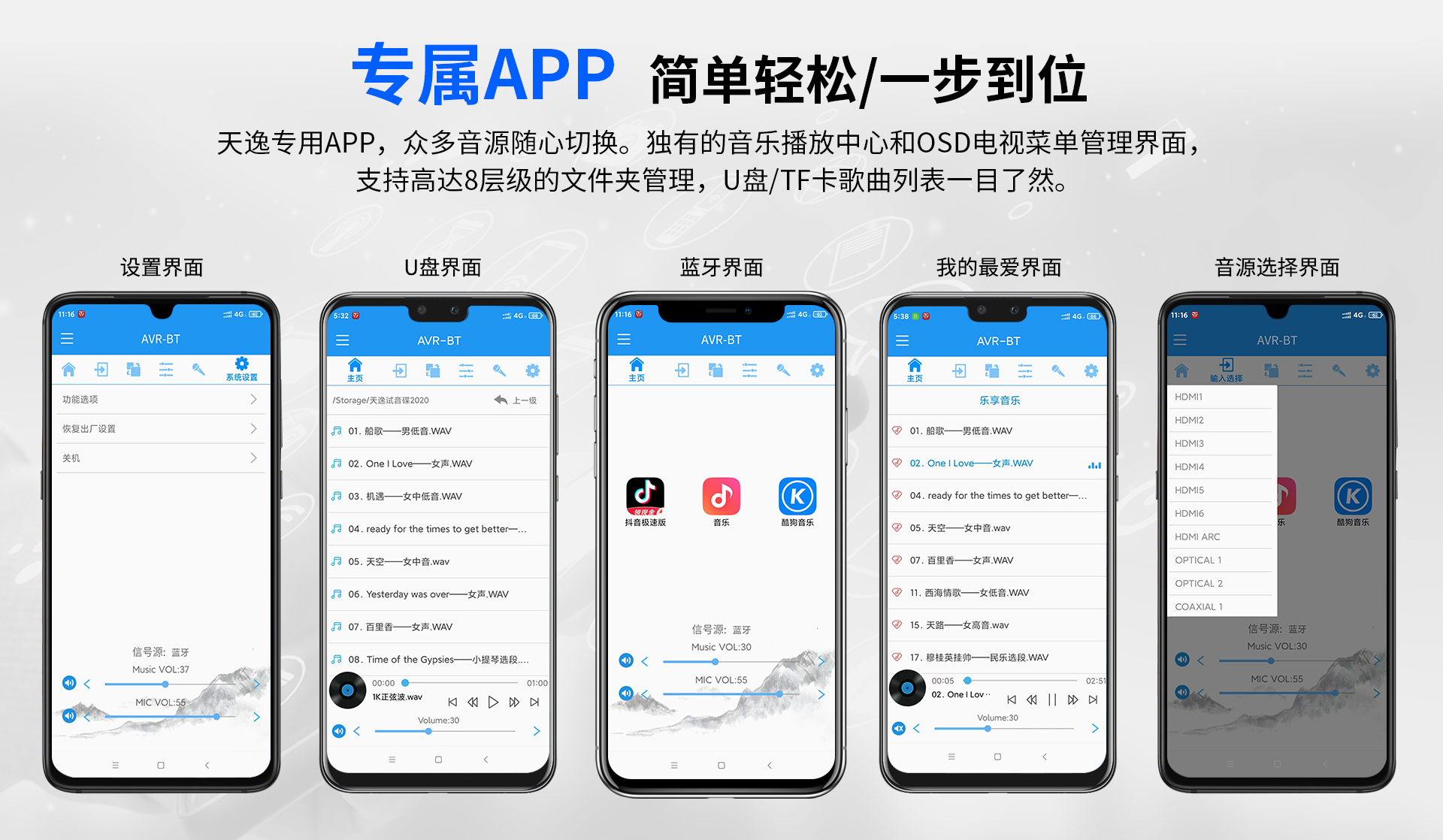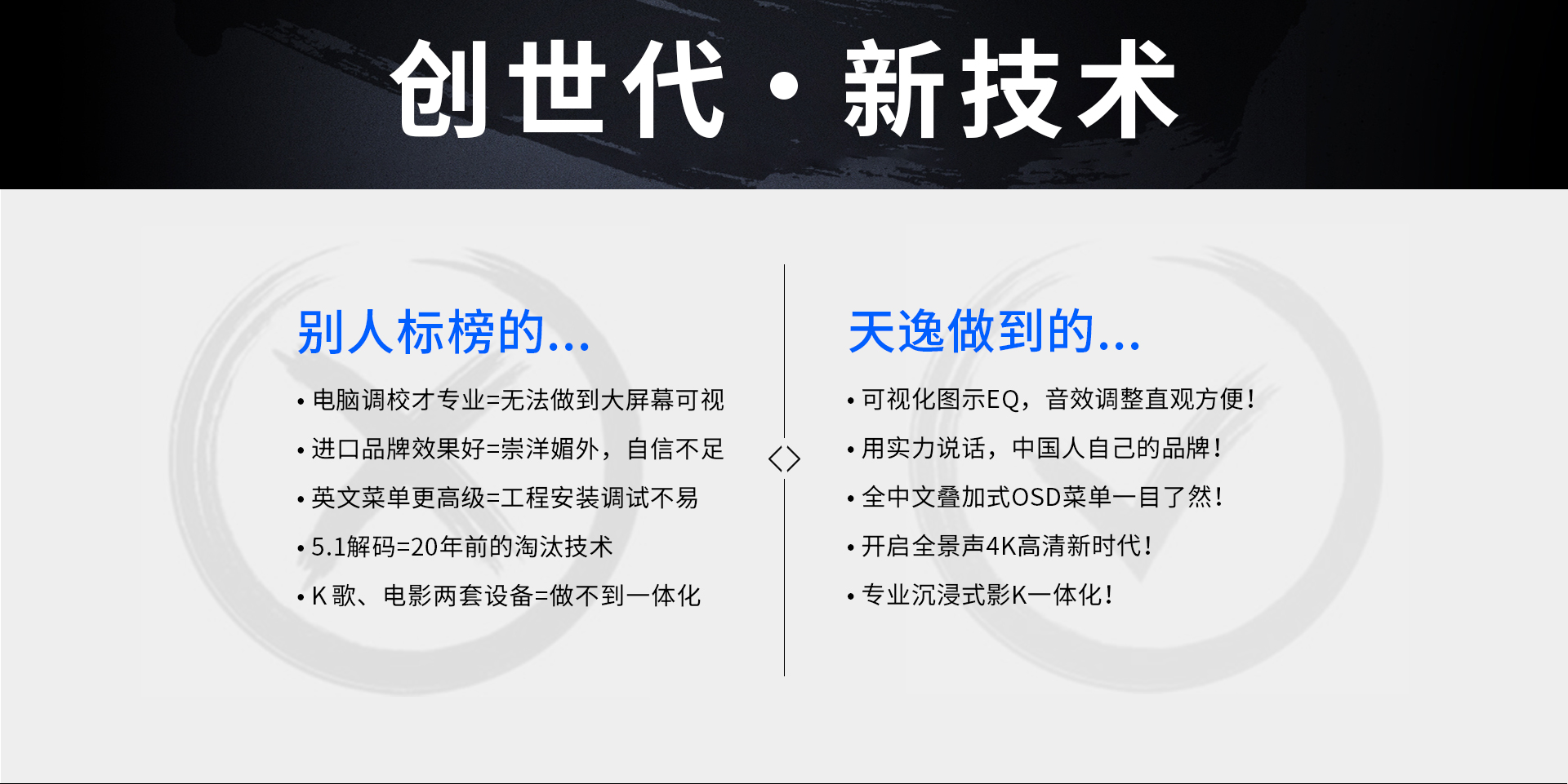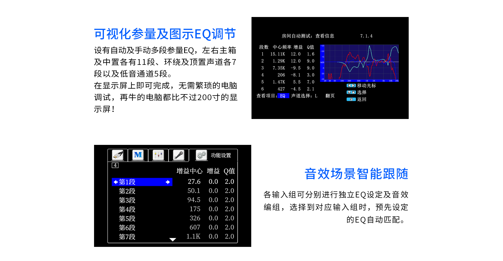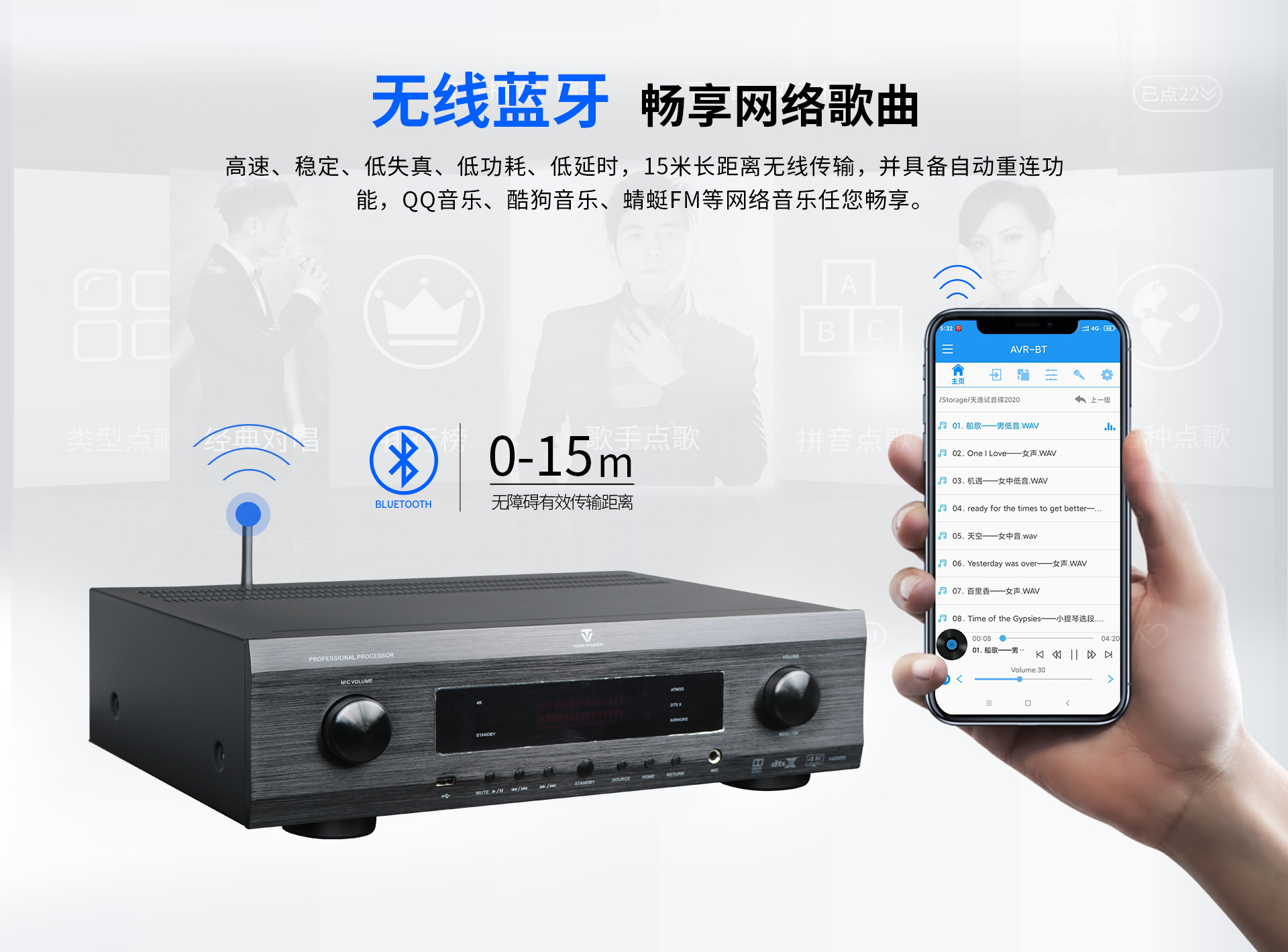 二、功能特點 1.支持Dolby Atmos、Dolby True-HD及向下兼容所有杜比音頻編碼文件; 2.支持DTS:X、DTS-Master及向下兼容所有DTS音頻編碼文件; 3.支持HDMI 2.1,支持HDCP2.2; 4.支持4K/60Hz,RGB4:4:4,18GHz全帶寬高清視頻信號; 5.支持Dolby Vision及HDR 10高清視頻信號; 6.多達12聲道的杜比全景聲7.1.4全平衡輸出; 7.內置7.2.4全景聲卡拉OK系統,強大的DSP數字混響效果及九級防嘯叫移頻處理技術,多種人聲風格選擇; 8.房間EQ、揚聲器距離、延時、聲壓的自動測試及補償,一鍵式操作,全自動校正,同時支持用戶手動調節; 9.內置藍牙數字聲場接收器; 10.內置高品質音樂播放器,支持TF卡及U盤音頻文件播放,支持FLAC、APE、WAV、MP3等多種無損及有損壓縮音頻格式,支持多層文件夾管理; 11.支持手機APP操作; 12.全中文音視頻疊加式OSD屏幕顯示菜單; 13.支持本地音樂信息可同步讀取顯示; 14.支持從2.0聲道到7.1.4聲道等10多種揚聲器配置; 15.支持HDMI 6進2出,2組同軸2組光纖數碼音頻輸出,3組模擬音頻輸入; 16.支持5.1聲道外部混音輸入,可外接混響器; 17.支持RS232集中控制器; 18.支持HDMI ARC音頻回傳,支持CEC控制; 19.支持高達1000ms時長的唇音同步調節; 20.每聲道多達5~11段參數EQ; 21.支持音視頻編組輸出; 22.選用美國ADI新一代雙核DSP處理器; 23.支持按輸入源獨立設置及保存參數的功能; 24.輸入源獨立EQ選擇,獨立卡拉OK控制,獨立音量調節記憶; 25.支持話筒音量及音樂音量的開機設置和最大音量限制; 26.支持5V連機觸發功能; 27.支持IR紅外延長功能。
