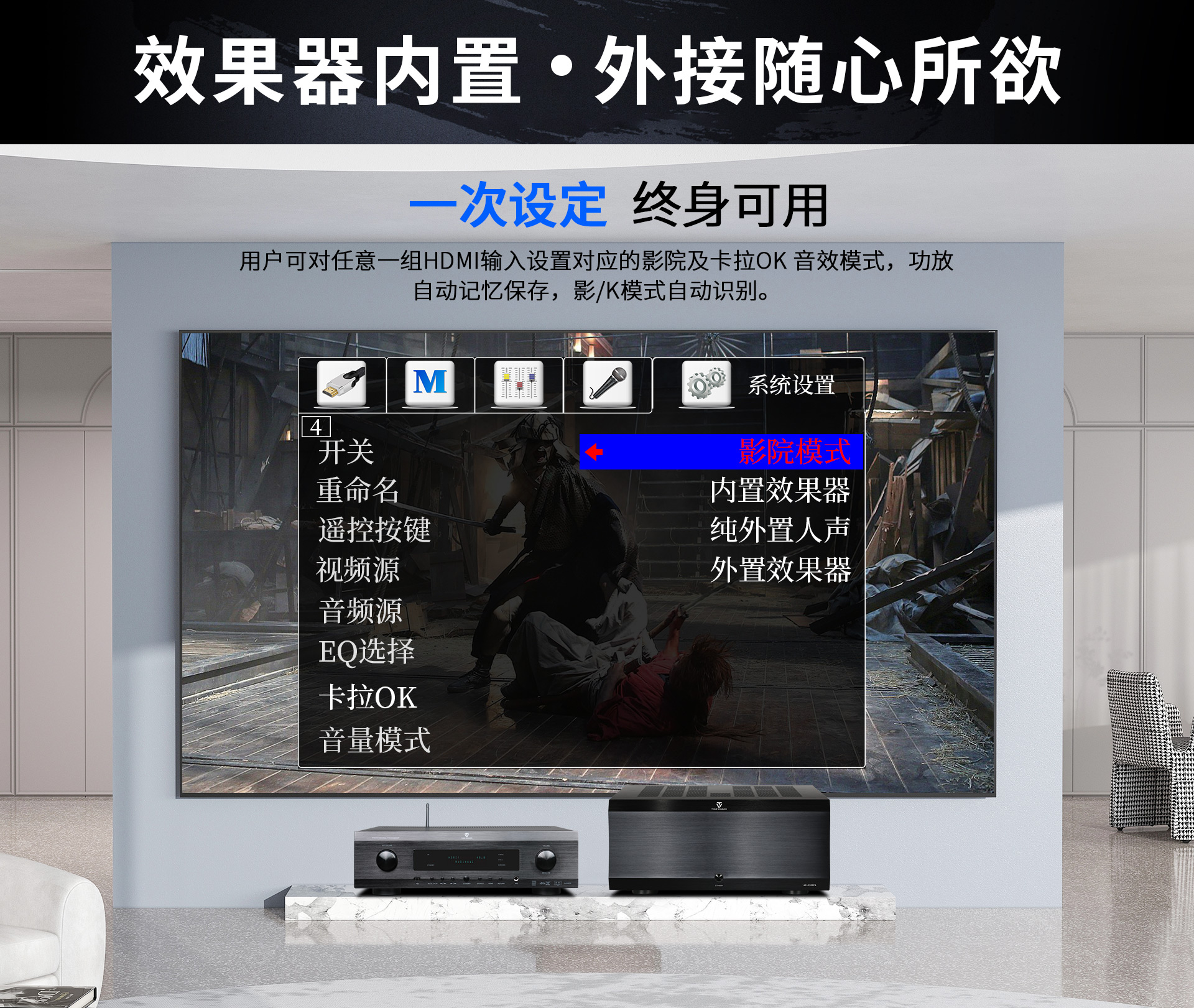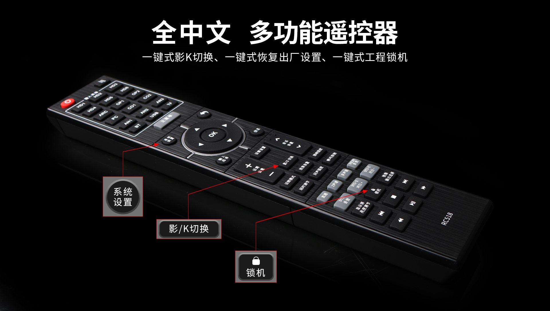| 適用場所:影吧、影K、多媒體會議室、娛樂活動中心、接待室等影音間 | 隨機配件:說明書、遙控器、HDMI線、影音四頭線、電池、兩芯電源線、合格證 |