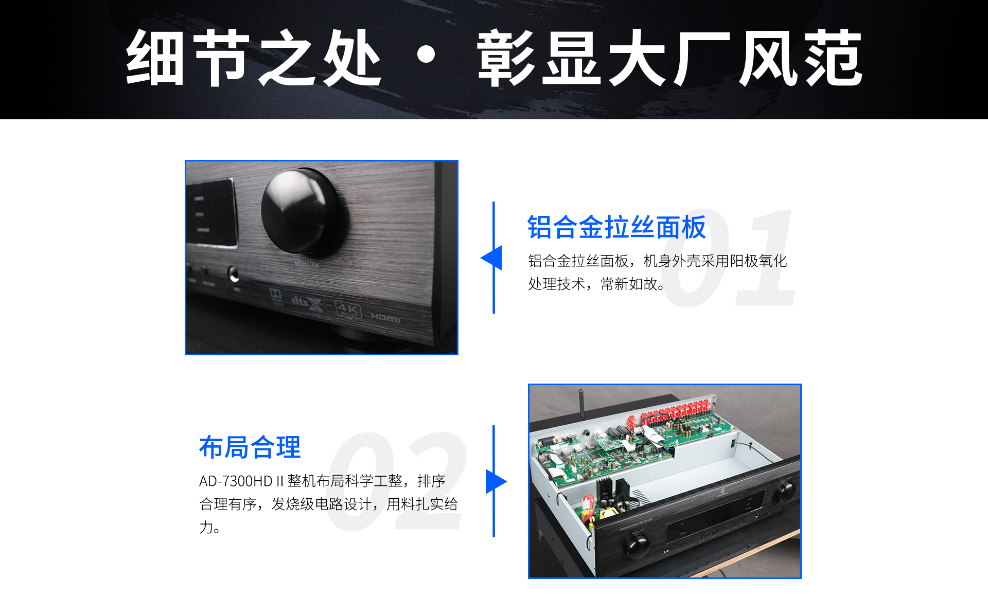 一、外觀特點 AD-7300HDII以雅致黑奠定內斂格調,金屬機身穩固耐用,更顯堅實質感。整體設計簡約而不失章法,中央屏幕直觀了然,兩側對稱分布的旋鈕帶來平衡的視覺美感,下方按鍵、接口布局規整,井然有序。面板經拉絲工藝處理,呈現溫潤細膩的平直紋理,光影流轉間,時尚與典雅完美交融。
